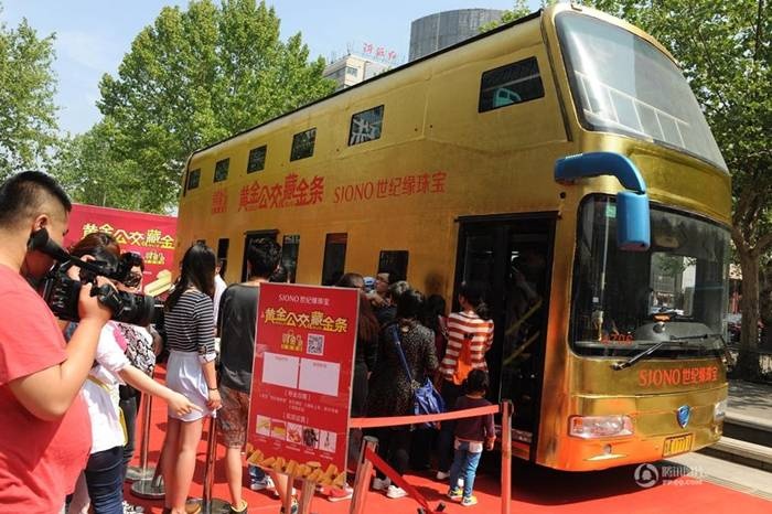 | Công ty trang sức SJONO ở Tế Nam (Trung Quốc) đã chi tiền làm một chiếc xe buýt dát vàng để thu hút khách hàng quan tâm tới xem. |