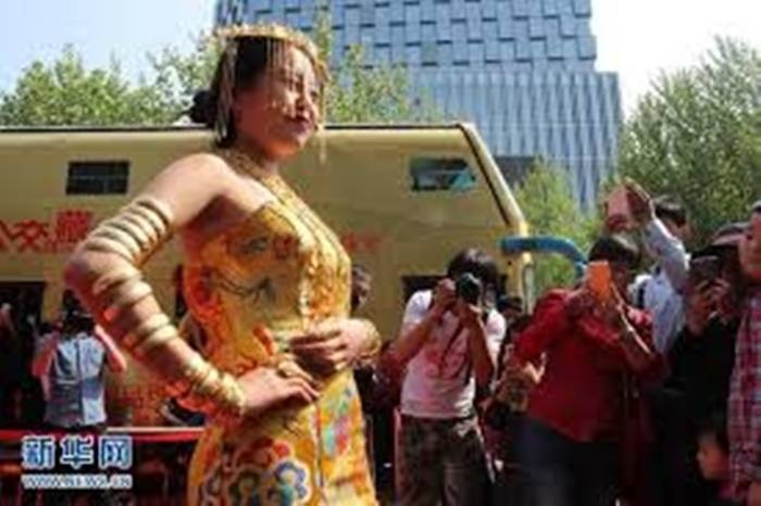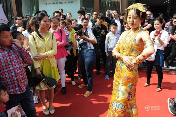 | Cô gái đeo kín vàng và đội mũ vàng trình diễn trước mọi người thu hút sự quan tâm của công chúng. |