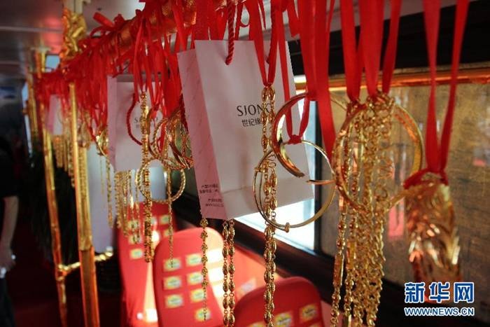| Số vàng cô gái đeo lên đến hàng chục cây, trị giá 2 triệu nhân dân tệ. 80% chiếc xe phủ vàng, trị giá toàn bộ 50 triệu nhân dân tệ. |