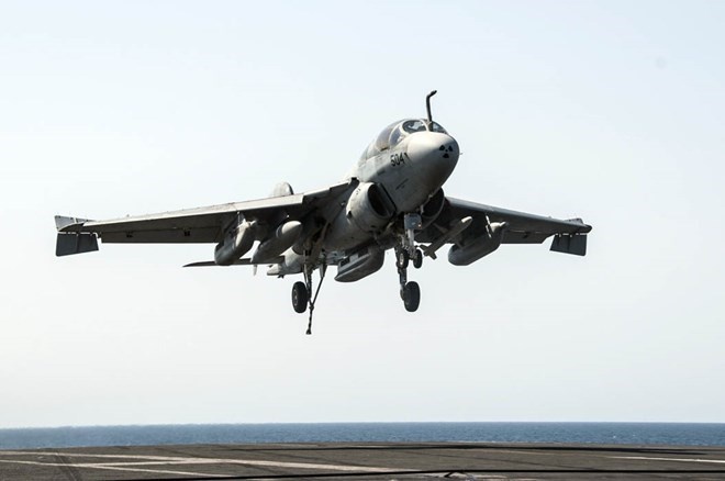| Chiếc EA-6B hạ cánh xuống tàu sân bay USS George H.W. Bush neo đậu ở vùng Vịnh sau khi không kích ISIL. Ảnh: Reuters/U.S. Navy |