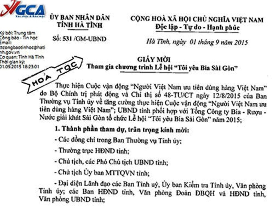 Giấy mời do ông Lê Minh Đạo, Chánh văn phòng tỉnh Hà Tĩnh ký và đóng dấu hỏa tốc gửi tới các lãnh đạo chủ chốt của tỉnh, thủ trưởng các sở ban ngành, đoàn thể cấp tỉnh, chủ tịch các hội, hiệp hội trong tỉnh, lãnh đạo các huyện trên địa bàn… để tới tham gia chương trình lễ hội “Tôi yêu Bia Sài Gòn”.