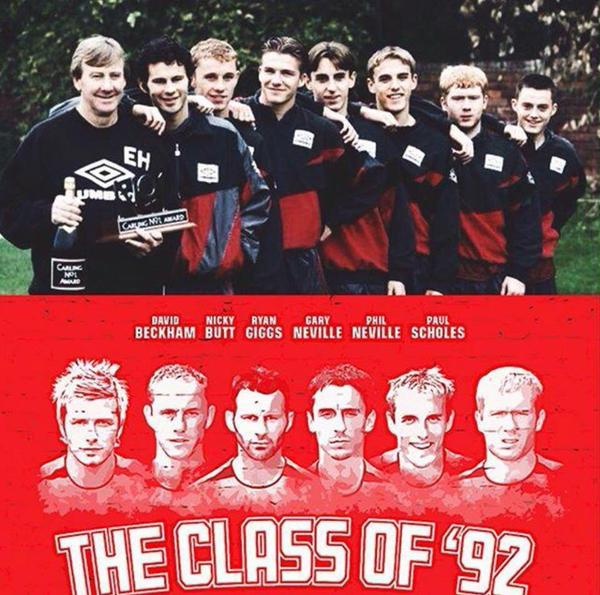 | BBC khẳng định đây là hình ảnh về "Thế hệ vàng 92" người hâm mộ chưa từng được thấy, gồm Phil Neville, Nicky Butt, Ryan Giggs, Gary Neville và Paul Scholes (từ trái qua phải). |