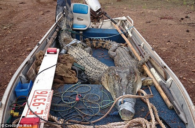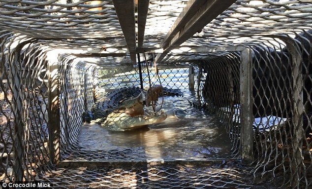 Mick tóm gọn một con cá sấu khác dài 4,3 m bằng phương pháp bẫy. Với cách này, các thợ săn có thể dễ dàng buộc miệng con vật bằng dây thừng. |
