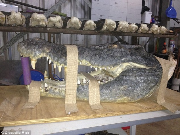 Đầu một con cá sấu do Mick lưu giữ. Ông thường bán hoặc mang con vật về nhà. Ông mất khoảng 8 tiếng để hoàn thành việc lột da nó. |