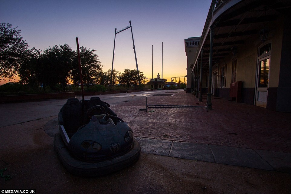 Chiếc xe nằm lăn lóc giữa công viên hoang vắng. Cây thường xuân leo kín nhiều tòa nhà và các công trình vui chơi.