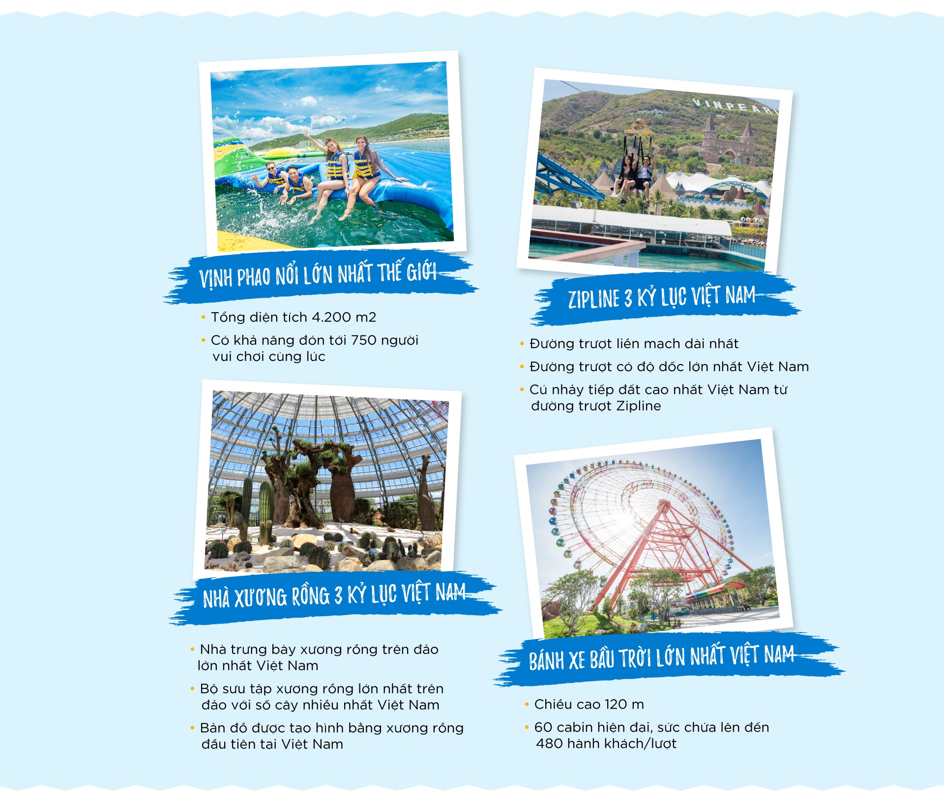 Việc khai trương Cáp treo vượt biển dài nhất thế giới (tính đến trước năm 2018), Vinpearl Land đã tạo nên một bước ngoặt lớn cho ngành du lịch Việt Nam khi liên tiếp lập ra những kỷ lục mới khiến thế giới phải khâm phục như Vịnh phao nổi lớn nhất thế giới, Cáp treo vượt biển dài nhất thế giới (tính đến năm 2018), Zipline 3 kỷ lục Việt Nam, Bánh xe bầu trời lớn nhất Việt Nam, hay Nhà xương rồng trên đảo độc đáo, lớn nhất hiện nay… Nhiều công trình mới lạ, lần đầu tiên xuất hiện tại Việt Nam đã đi vào hoạt động, đón hơn hàng chục nghìn lượt khách tham quan, trải nghiệm mỗi ngày.