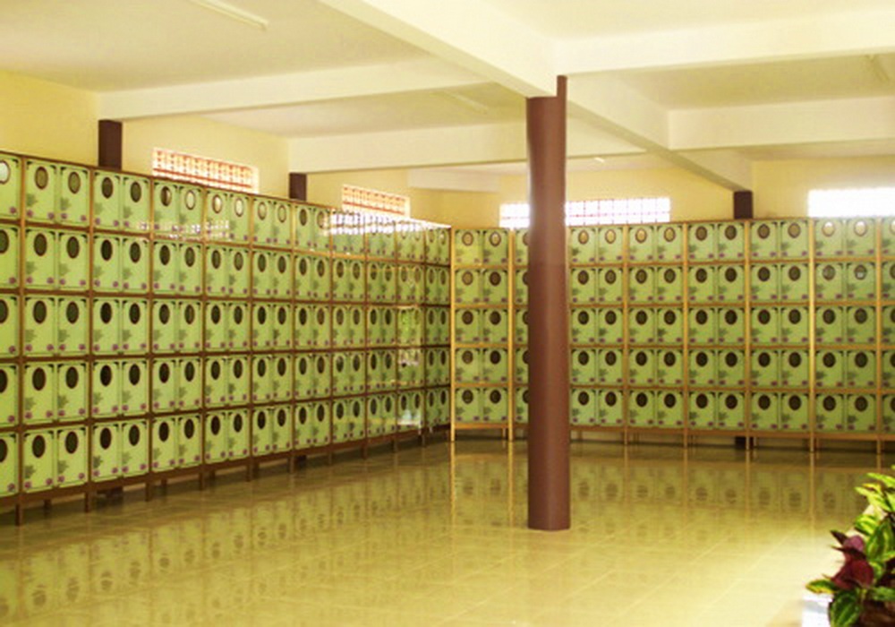 Bên trong nhà lưu tro cốt, mỗi lọ tro cốt được bỏ vào tủ riêng có ghi đầy đủ thông tin bên ngoài.