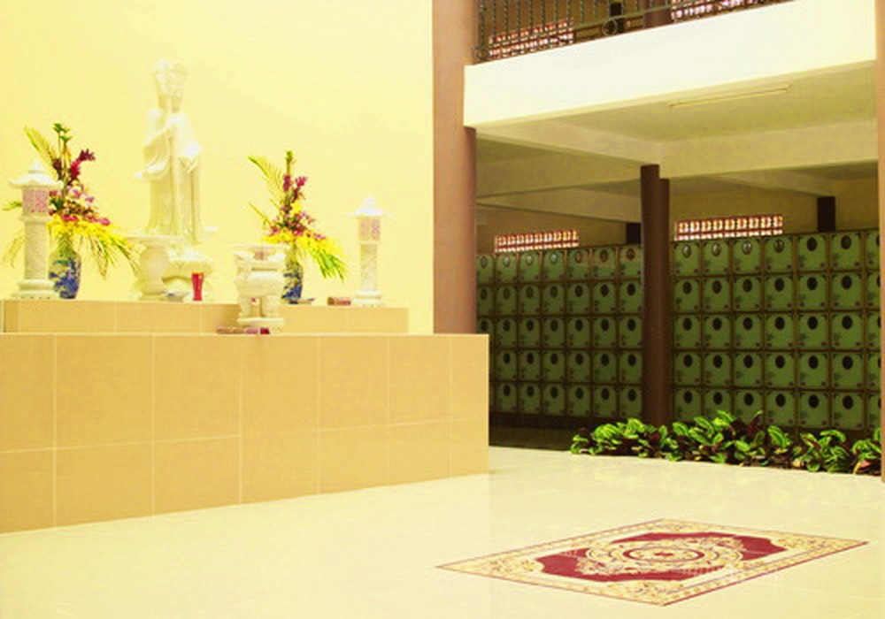 | Bên tả và hữu của đền thờ là là 2 khu nhà lưu tro cốt cao 4 tầng. |