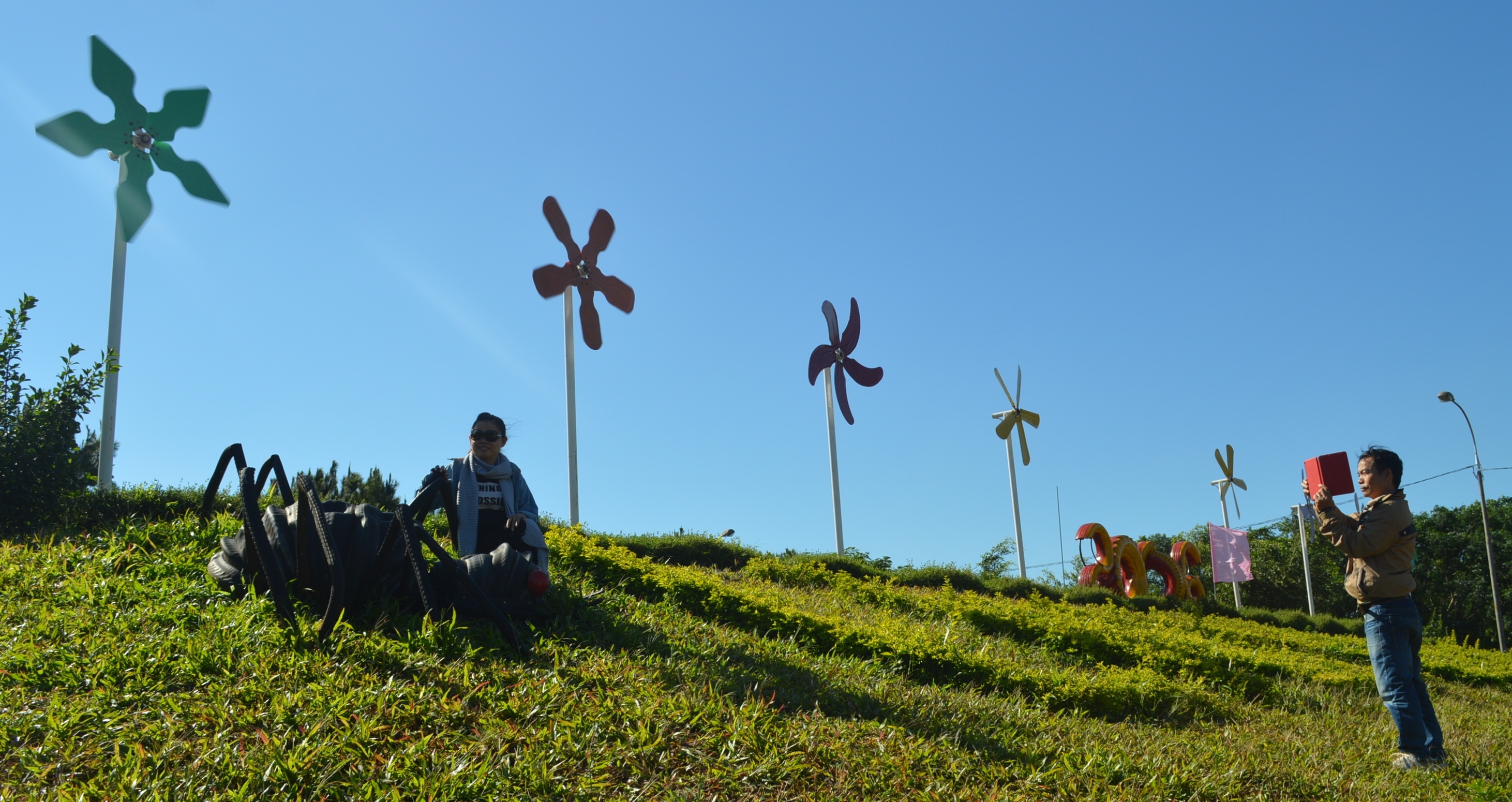 | Công viên không những thu hút trẻ em, nhiều người lớn cũng đến đây tham qua và chụp hình. Trong ảnh các cây quạt gió được làm từ những phế liệu đơn vị thu được. |