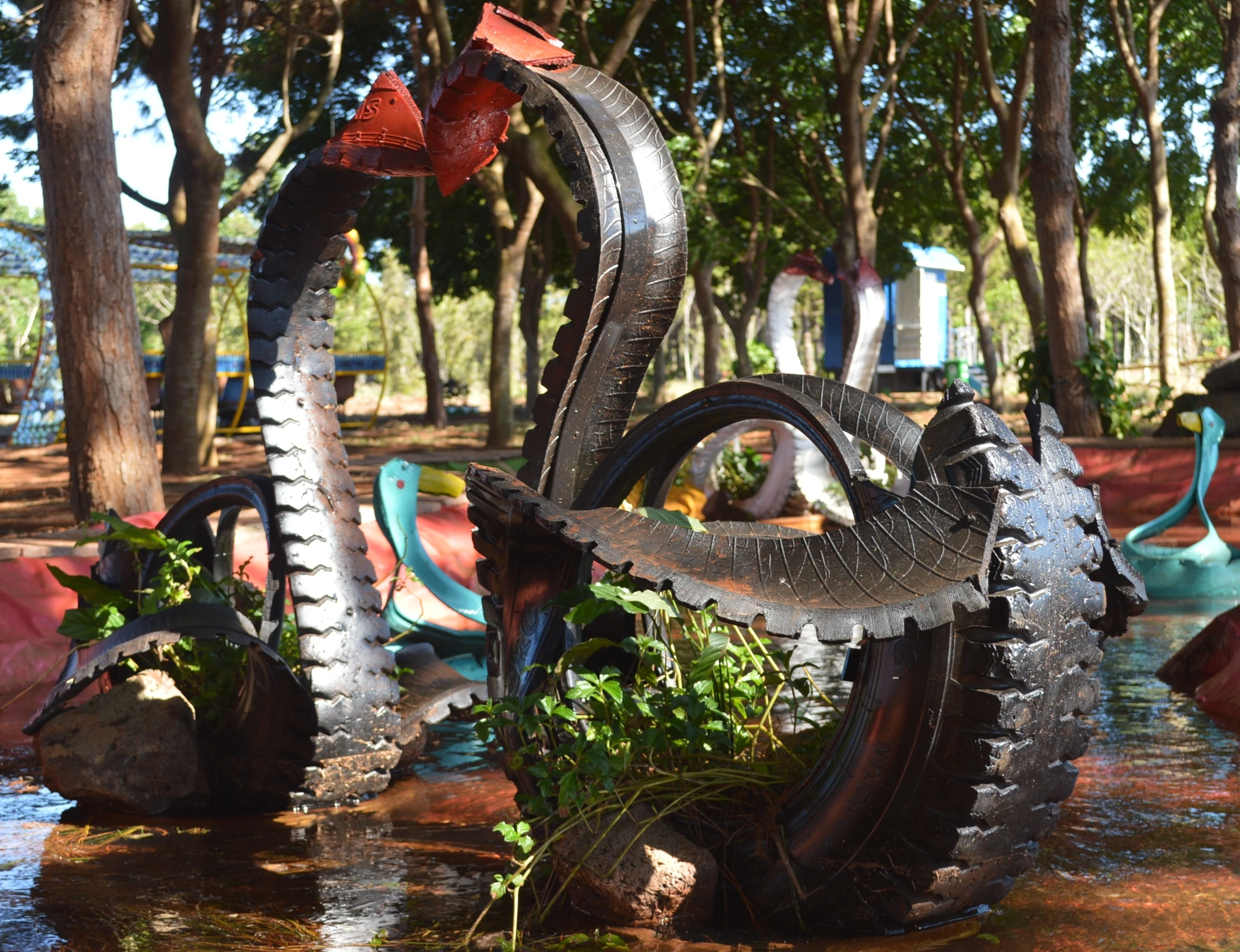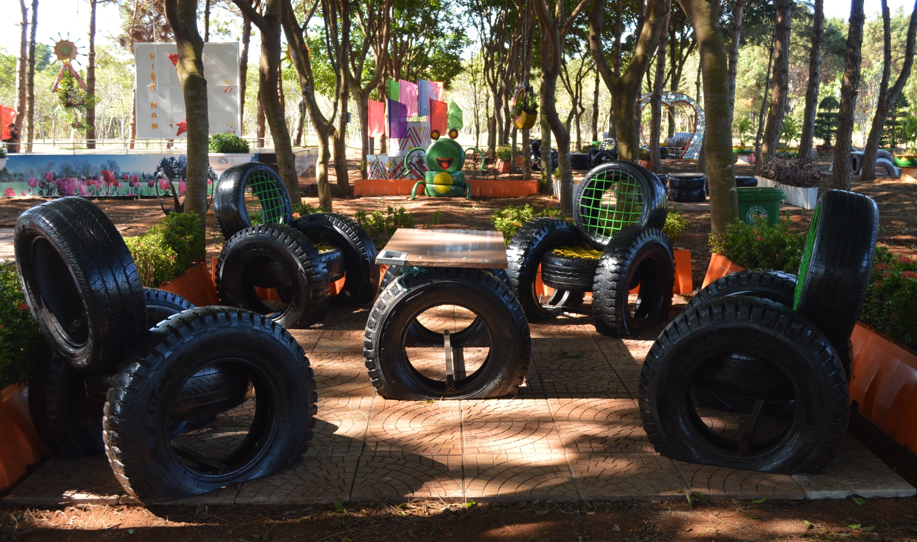 Những sản phẩm như gà, voi, nhện được làm bằng vành và lốp xe mô tô, xe đạp, đèn dây điện, bộ bàn ghế, bộ ấm trà từ lốp xe ô tô, dải phân cách làm thành chậu trồng hoa hay đến dòng suối nhân tạo…