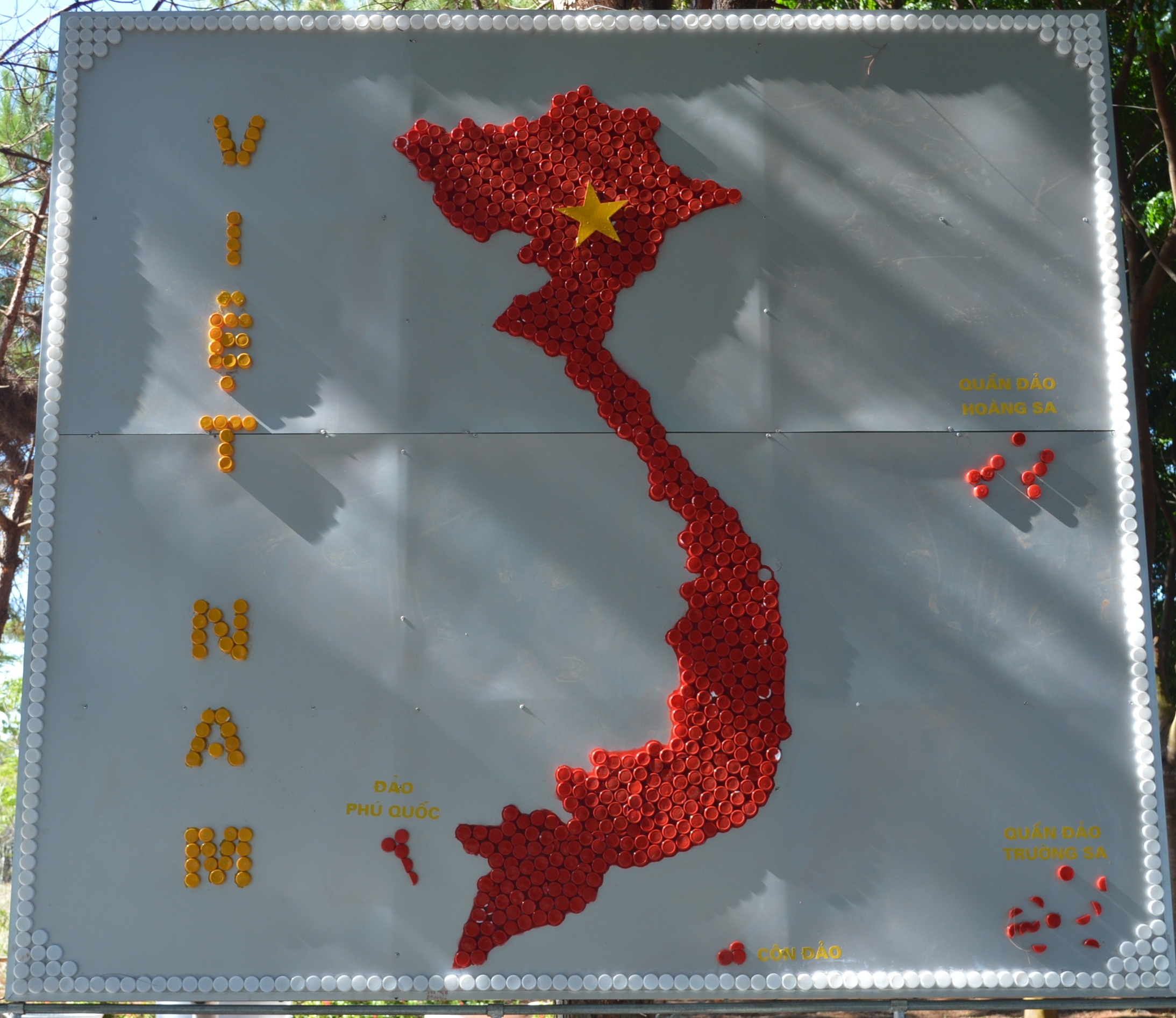 | Bản đồ Việt Nam được làm từ hàng trăm nắp chai nhựa vứt đi. |