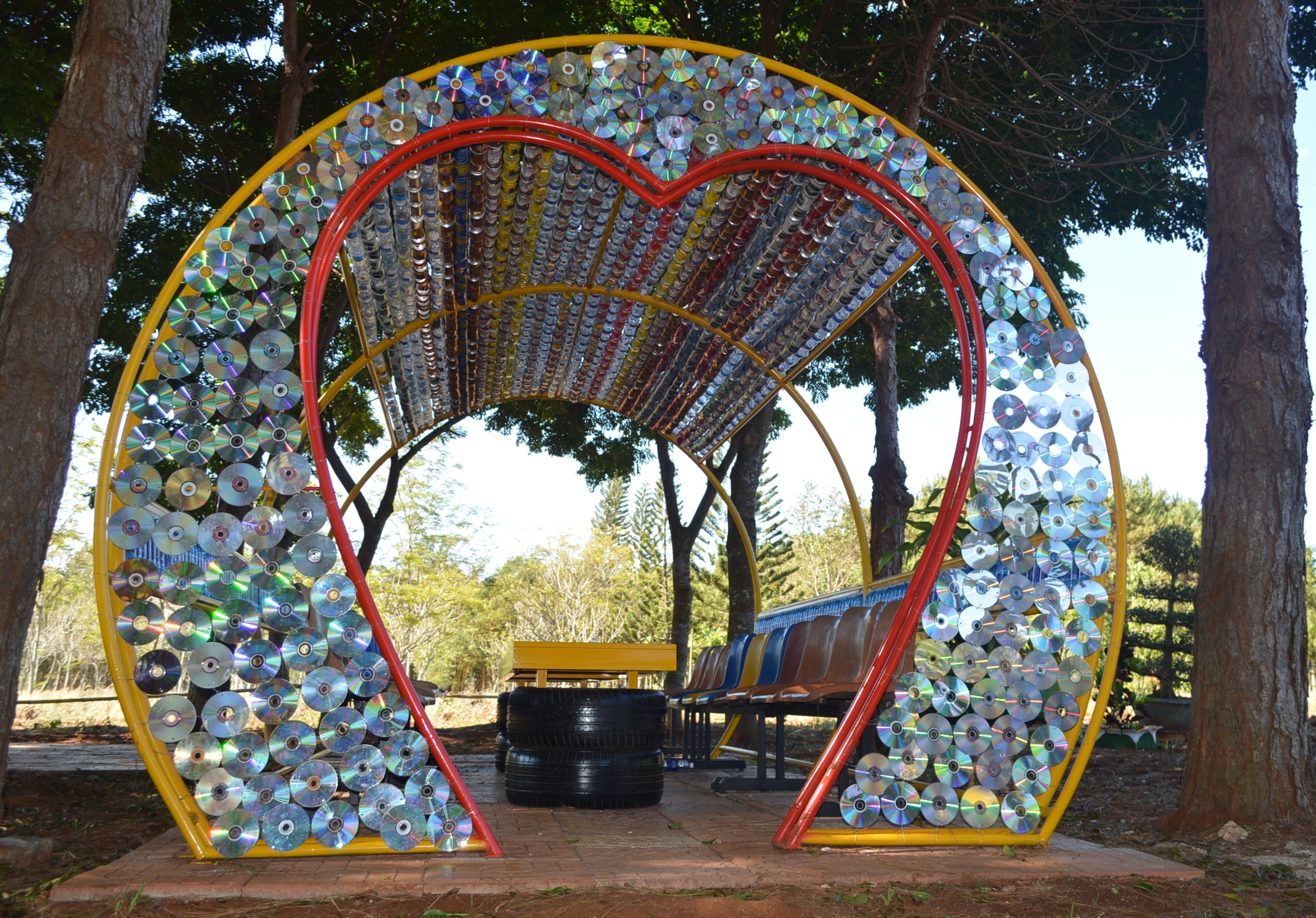Những phế liệu như lốp xe, dây điện, thùng rác, chai lọ thủy tinh… được chế tác thành những đồ vật trang trí độc đáo mang thông điệp bảo vệ môi trường.