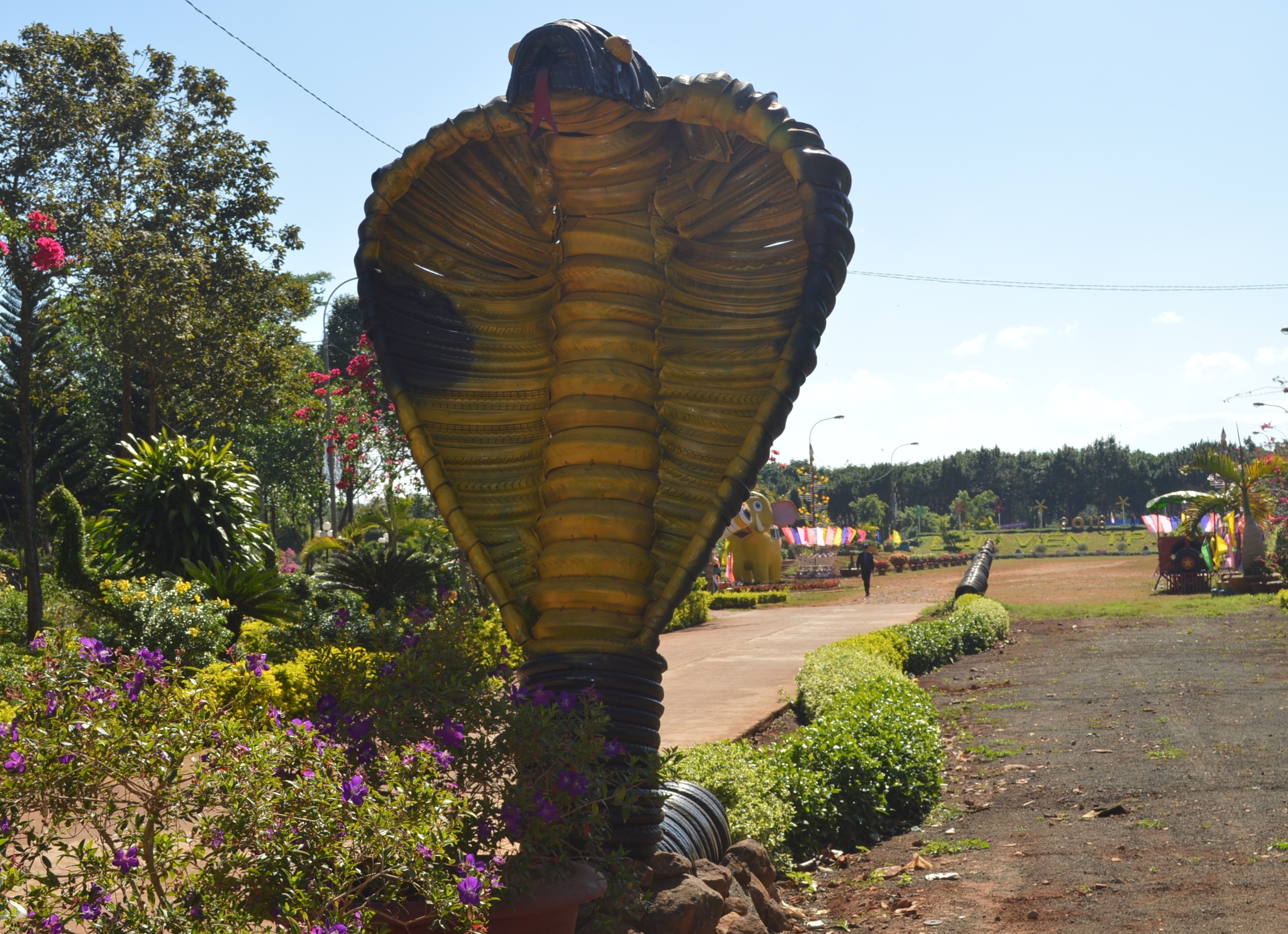 Trong ảnh một con rắn hổ mang được làm từ lốp xe có chiều dài hơn 20 m. |