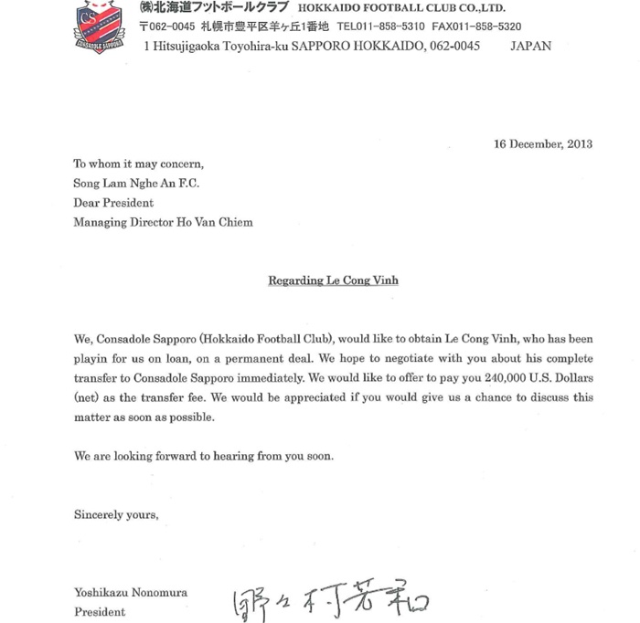 | Một trong những bức thư Sapporo gửi cho SLNA đề nghị mua Công Vinh. |