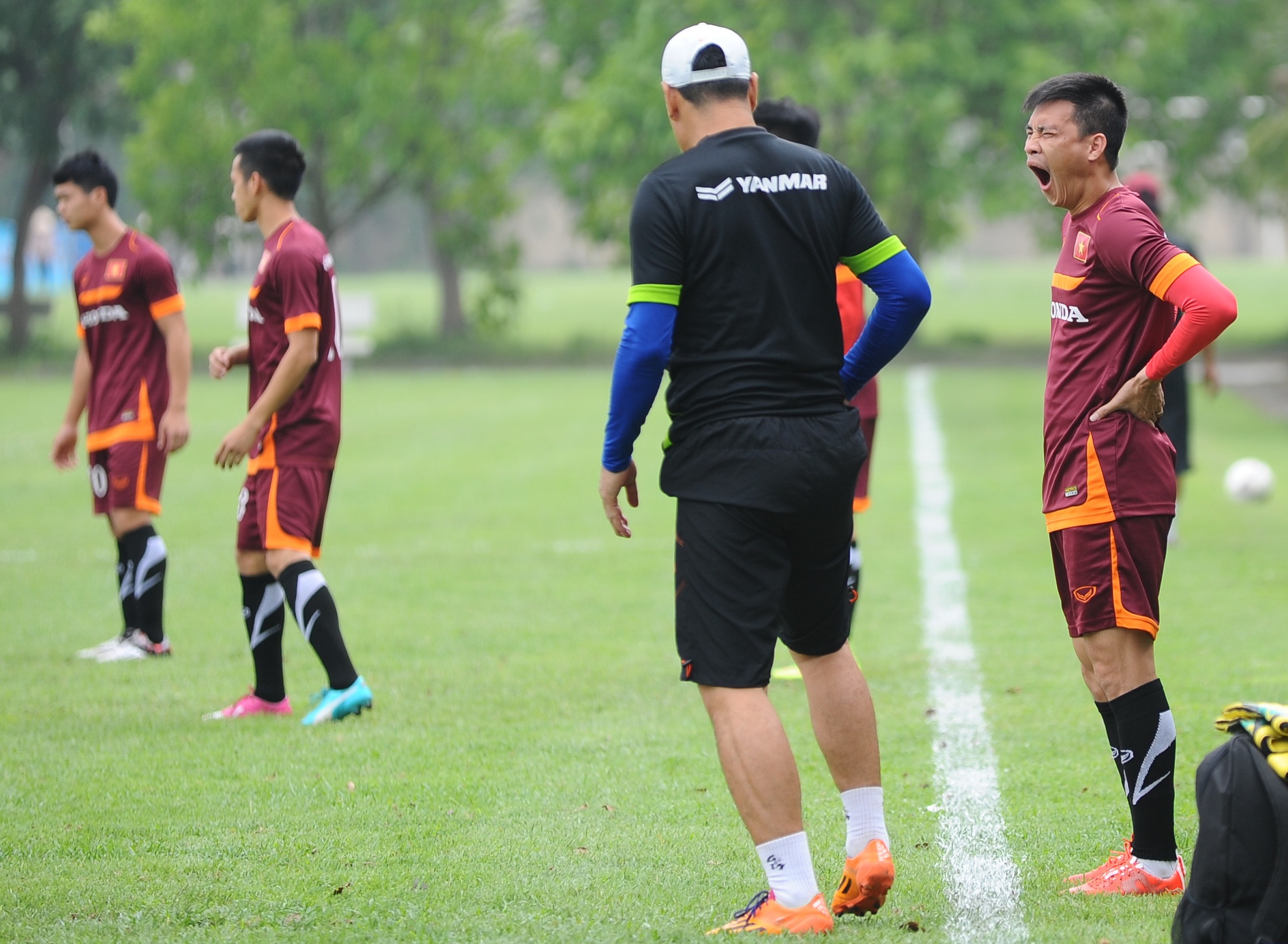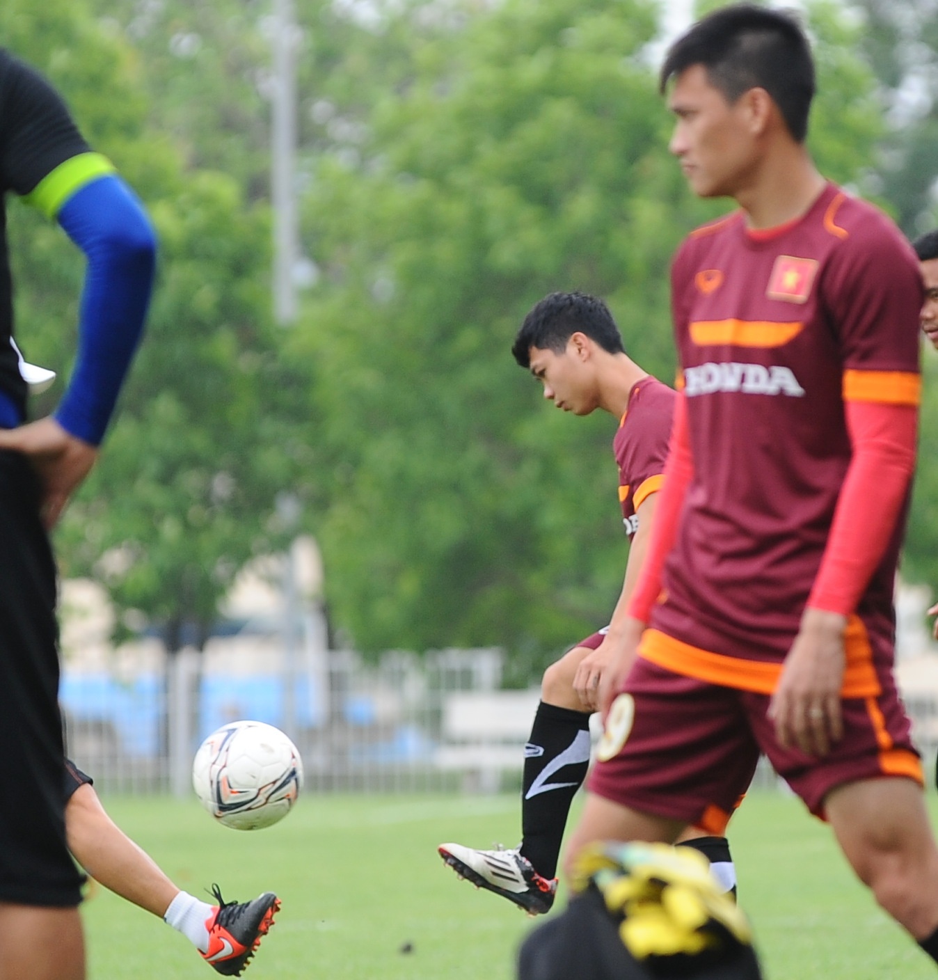 | Sau màn chạy khởi động, Công Vinh tham gia bài đá ma cùng các đồng đội để duy trì cảm giác bóng. |