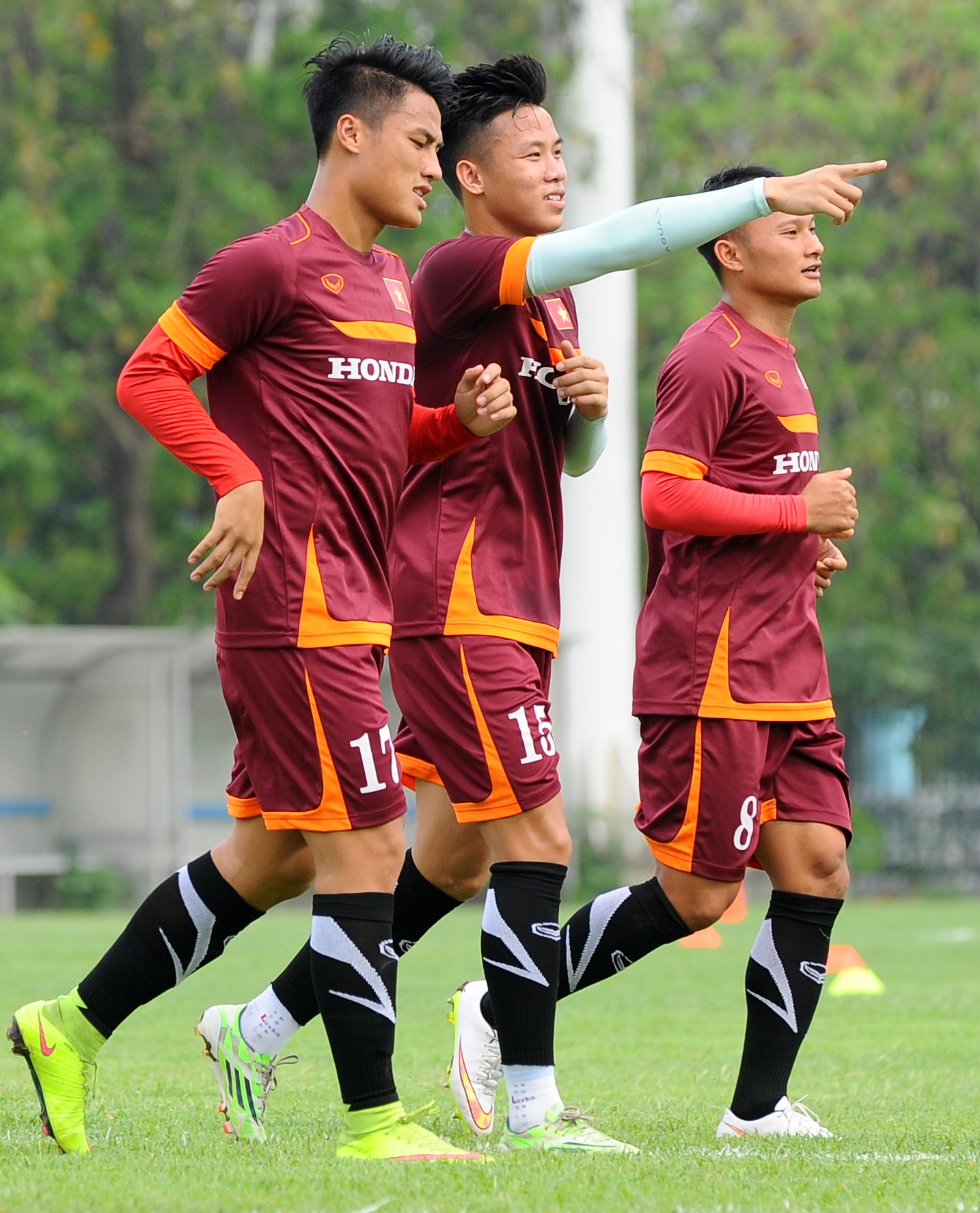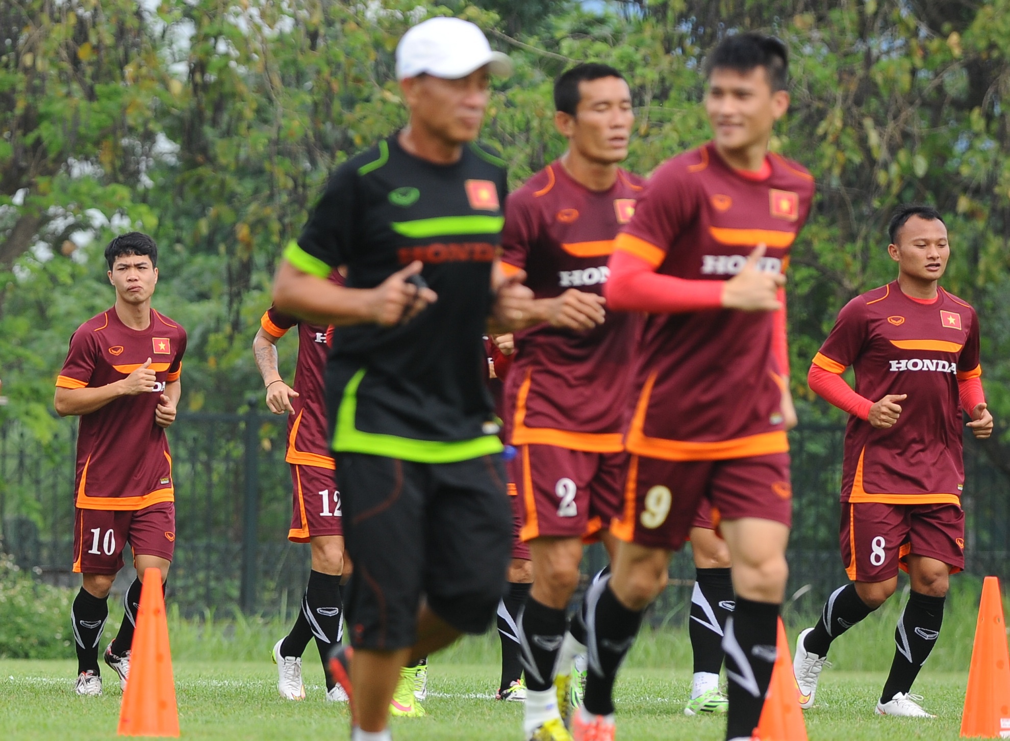 | Công Vinh không tham gia các bài tập đá đối kháng. Anh chạy khởi động cùng toàn đội. |