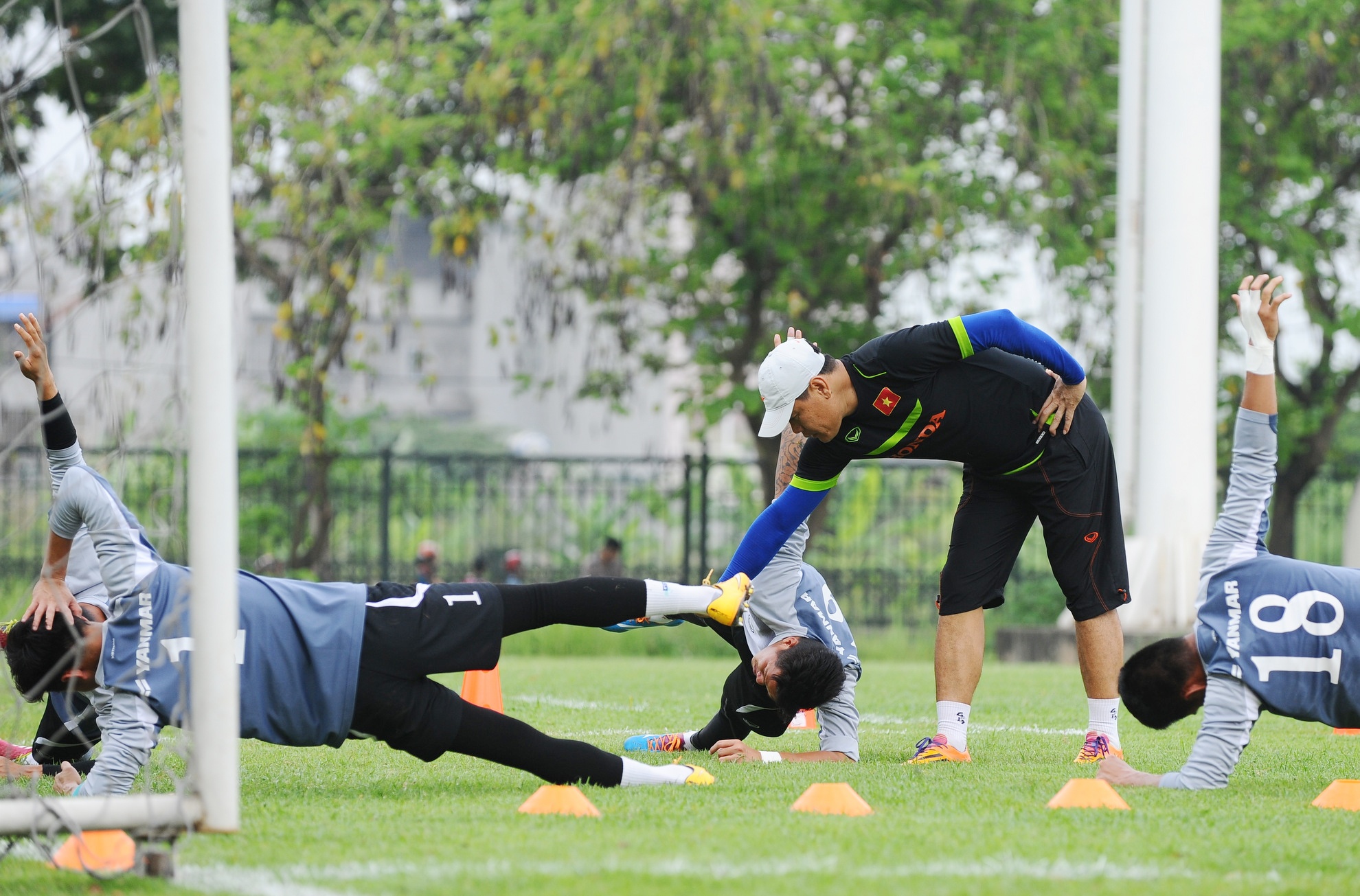 | Trợ lý HLV hướng dẫn 4 thủ môn của ĐT Việt Nam căng cơ. |