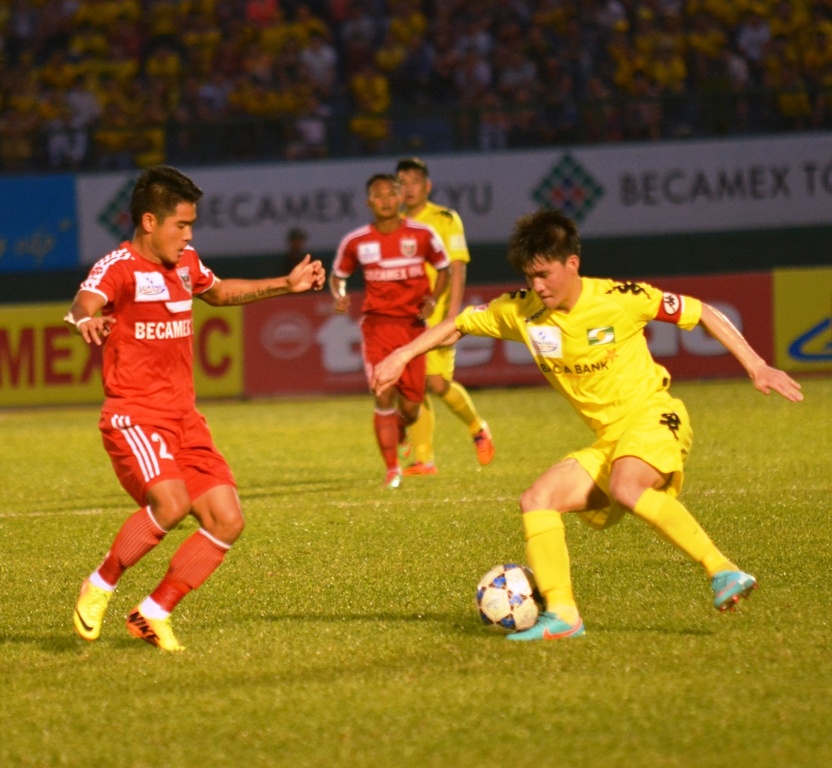| Khi chơi ở cánh Lê Công Vinh bị Âu Văn Hoàn theo rất sát nên không phát huy được hiệu quả. |