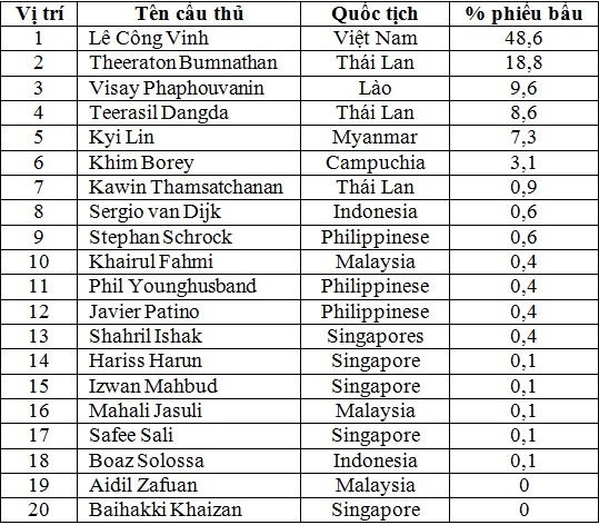 | Lê Công Vinh đang áp đảo danh sách 20 cầu thủ xuất sắc nhất Đông Nam Á. |