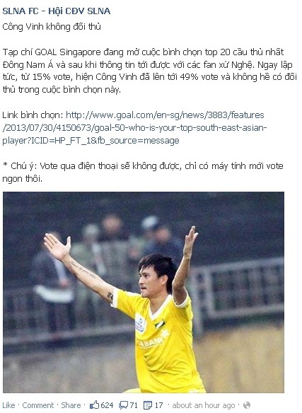 Với lời kêu gọi của Hội CĐV SLNA (gần 80.000 thành viên), Công Vinh đã có bước nhảy vọt trong top 20. |