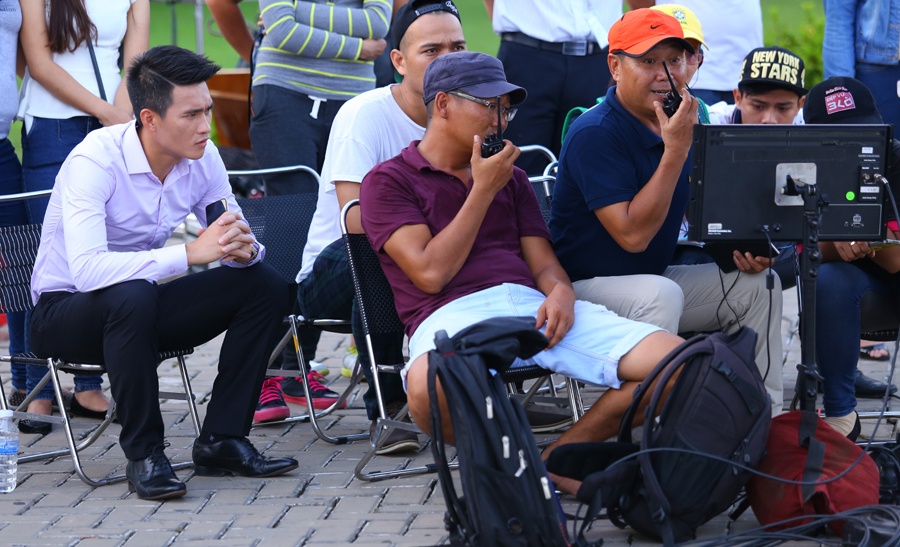 | Sau một ngày làm việc, Công Vinh cùng bà xã và đoàn phim xem lại những cảnh quay của mình. |
