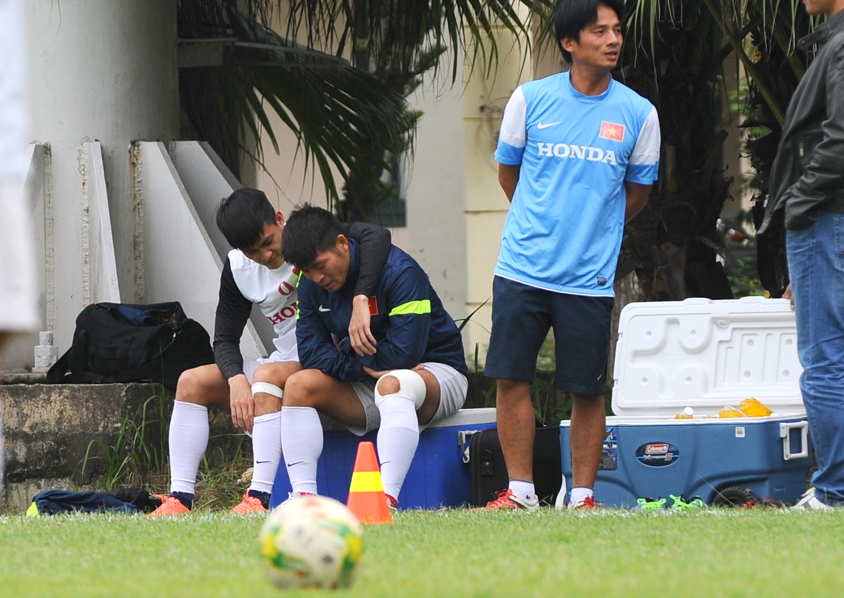Trong buổi tập sáng nay, tiền vệ Minh Châu buồn bã vì không thể tập luyện cùng các đồng đội do chấn thương dây chằng đầu gối.