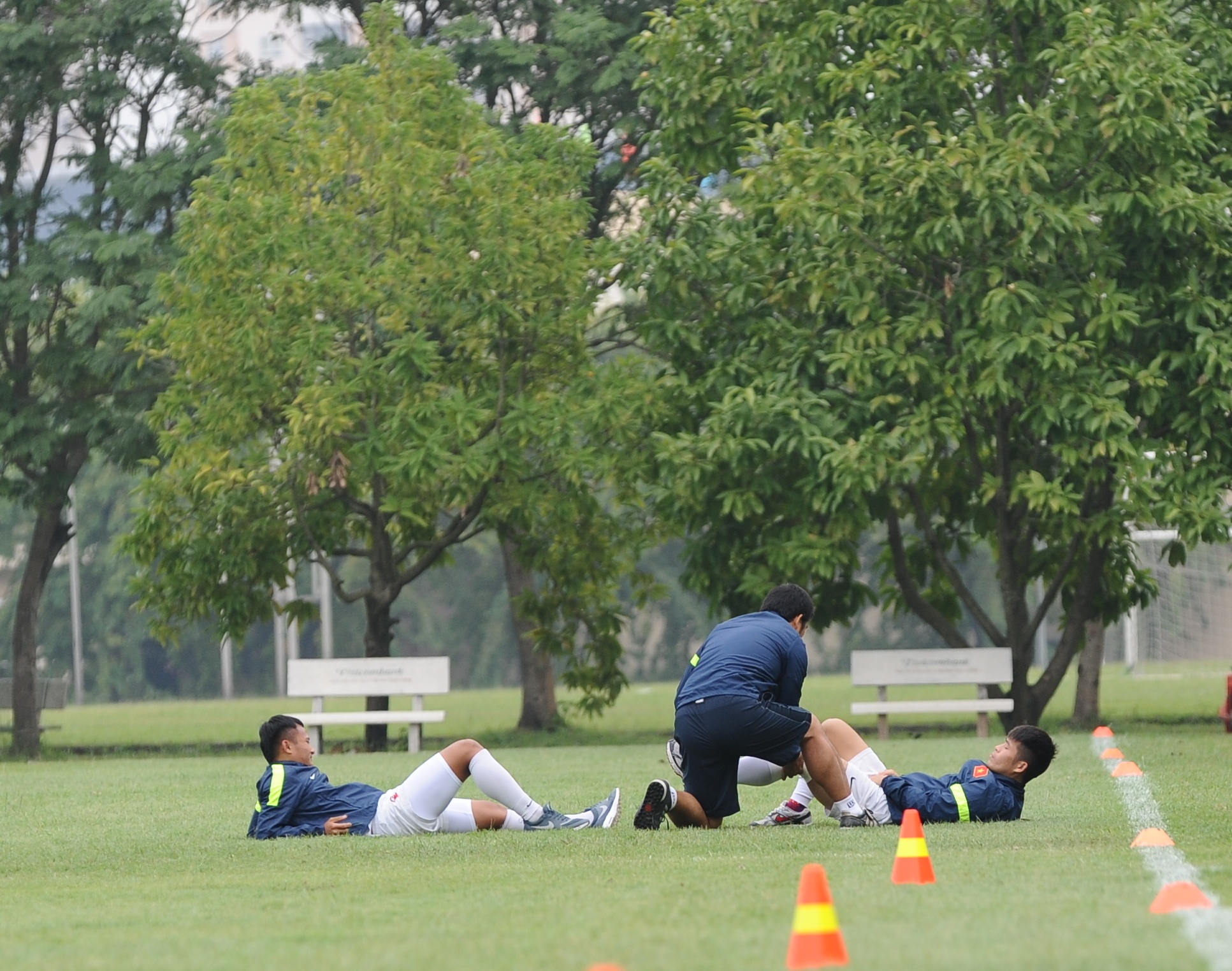 | Không chỉ riêng Minh Châu, tiền vệ Trọng Hoàng cũng vẫn phải tập bài tập hồi phục riêng của HLV thể lực người Nhật Bản. |