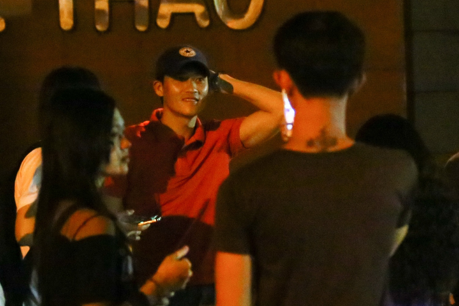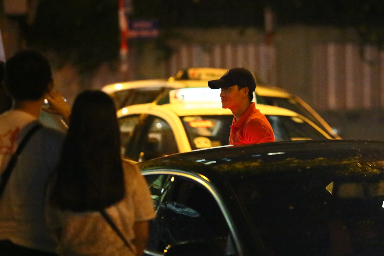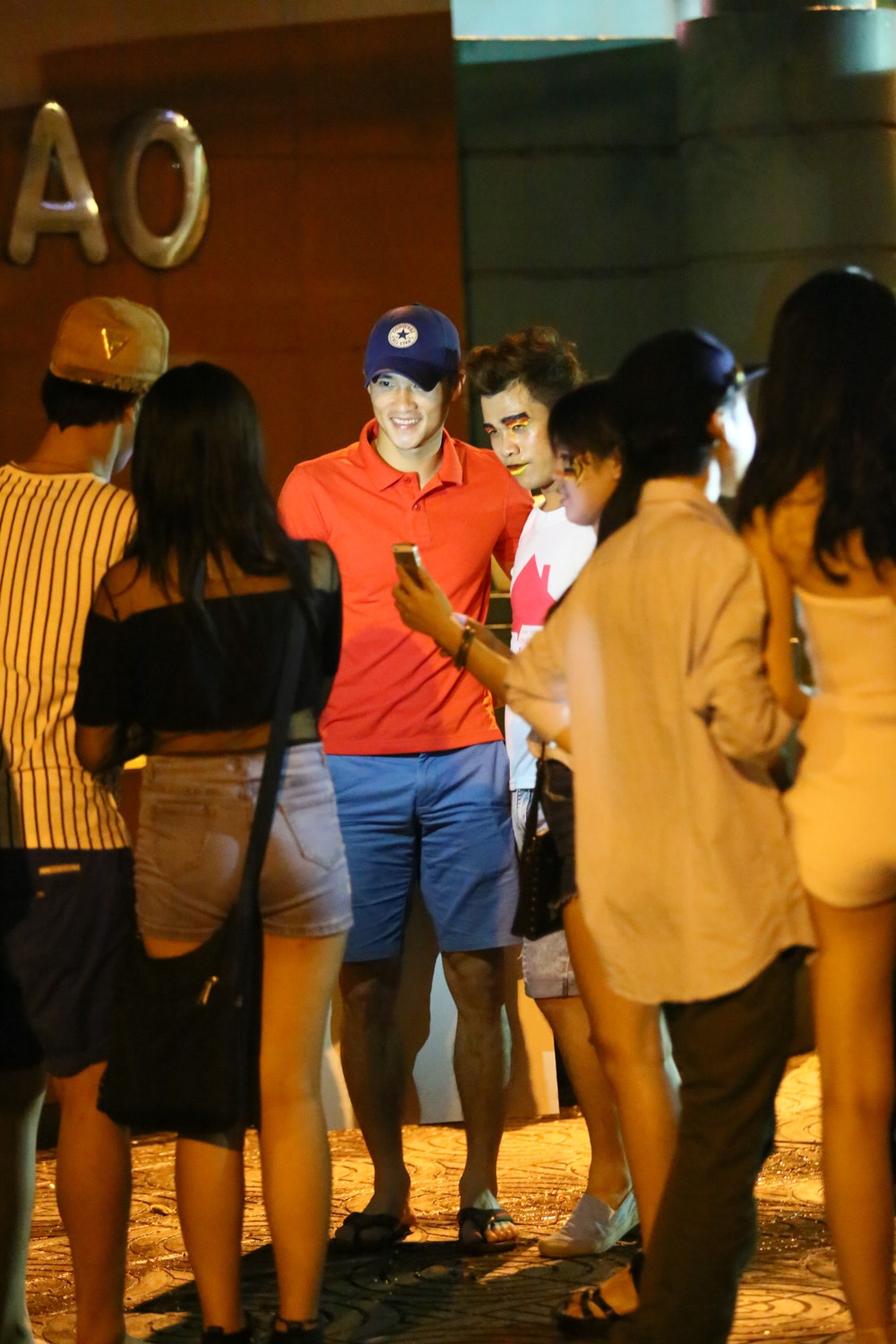 Công Vinh ăn mặc giản dị khi đưa đón vợ đi diễn. Anh chàng được nhiều fan bóng đá và người hâm mộ của Thủy Tiên xin chữ ký và chụp ảnh chung.