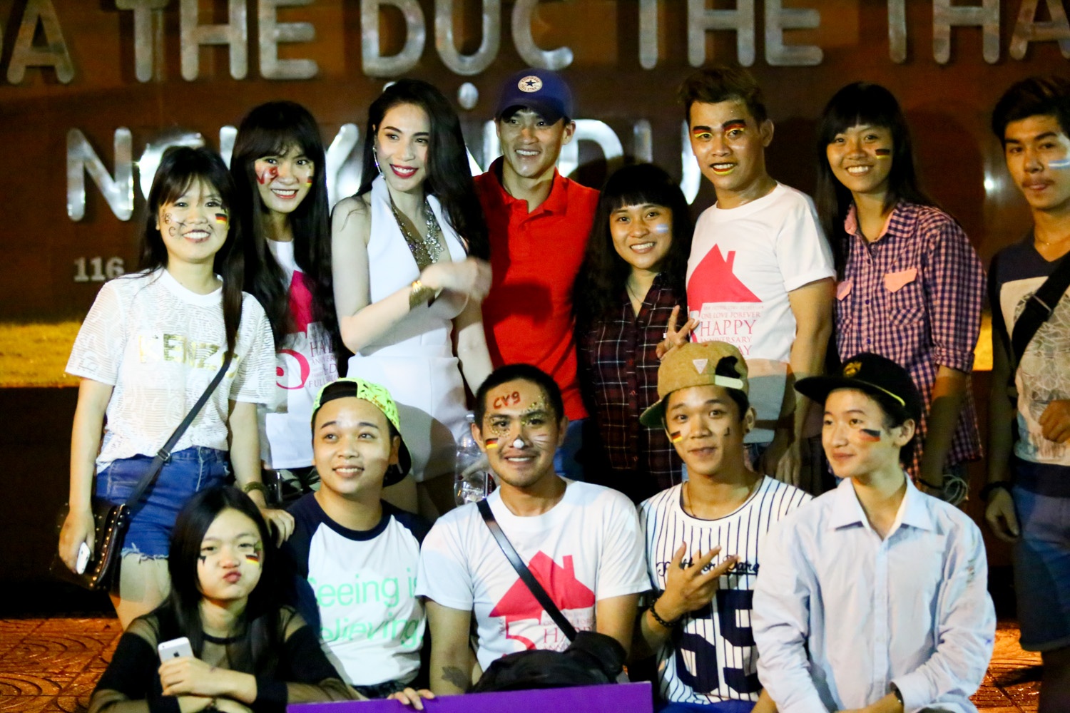 Vợ chồng Công Vinh - Thủy Tiên chụp ảnh cùng fan trước khi ra về.