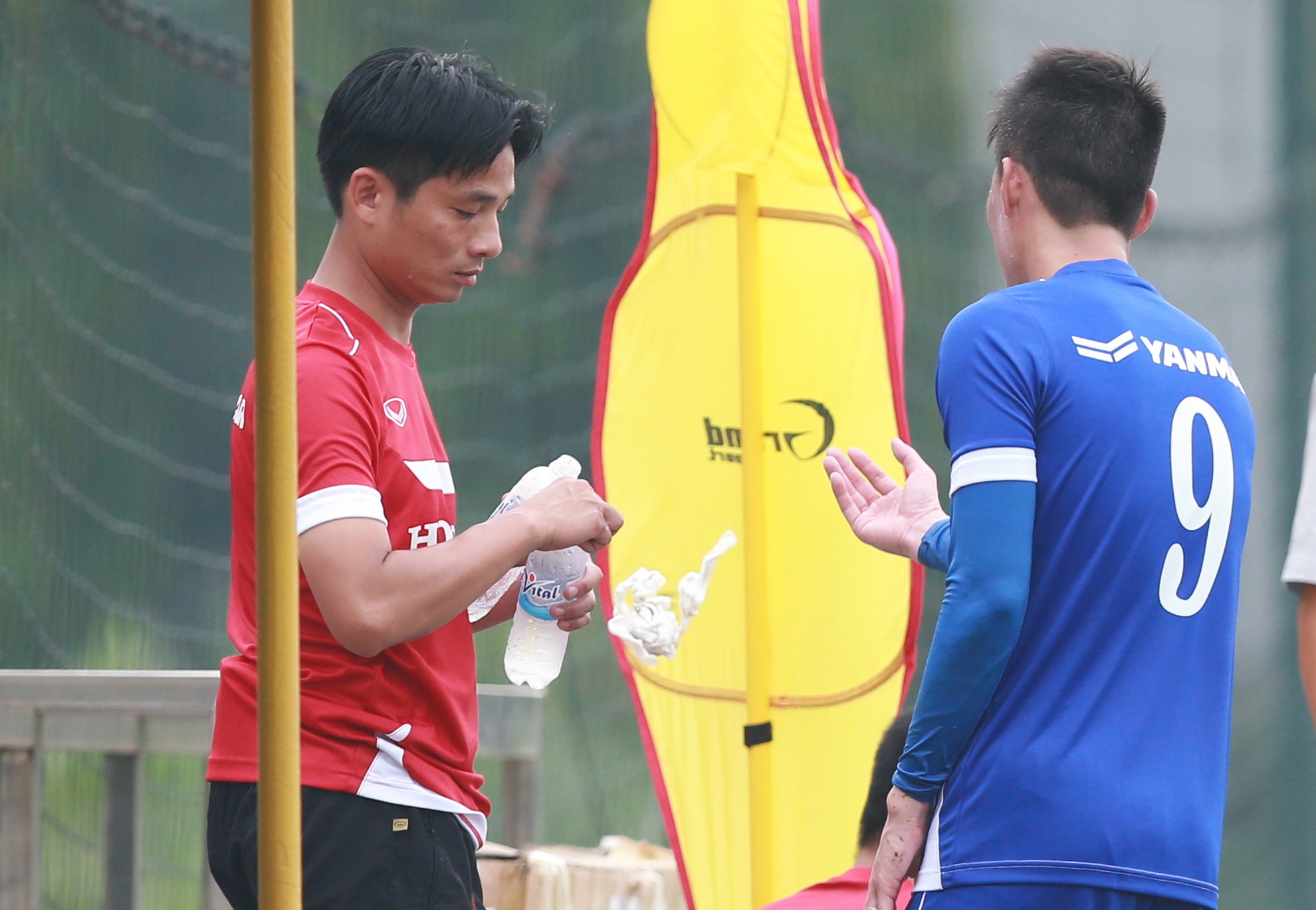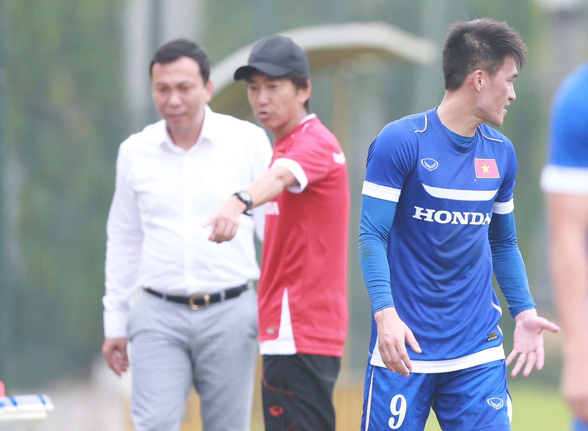 | Sau khi kết thúc buổi tập chiều 12/5, Phó chủ tịch VFF - ông Trần Quốc Tuấn và HLV Miura có cuộc trao đổi riêng ở khu vực kỹ thuật của ĐT Việt Nam. Nhà cầm quân người Nhật Bản không hài lòng khi có nhiều rác y tế ở quanh khu vực ông tiếp quan chức VFF. |