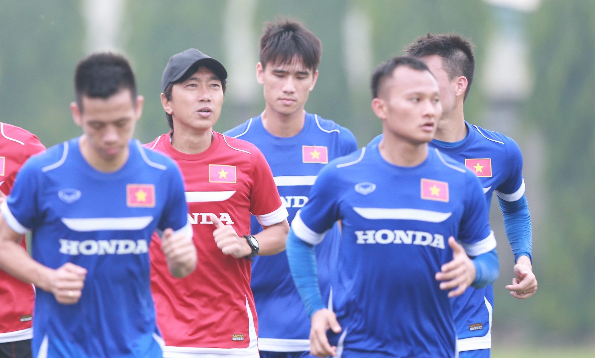 | HLV Miura cùng các học trò chạy 5 vòng quanh sân tập trước khi trở về khách sạn nghỉ ngơi. |