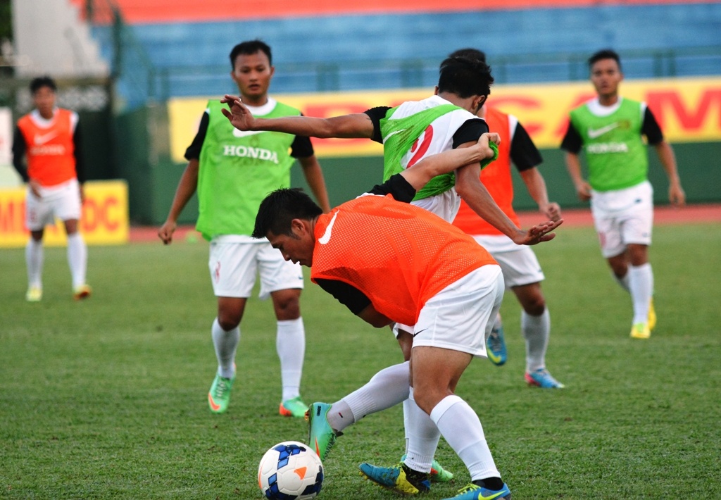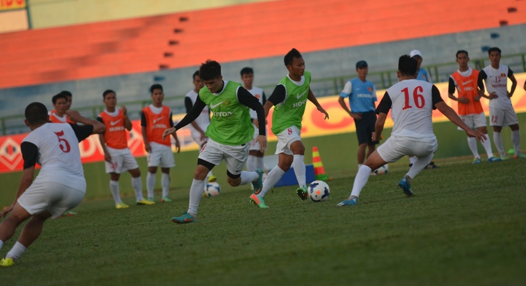 | Các cầu thủ tập luyện rất hăng say, quyết liệt chẳng khác một trận đấu thực thụ. |
