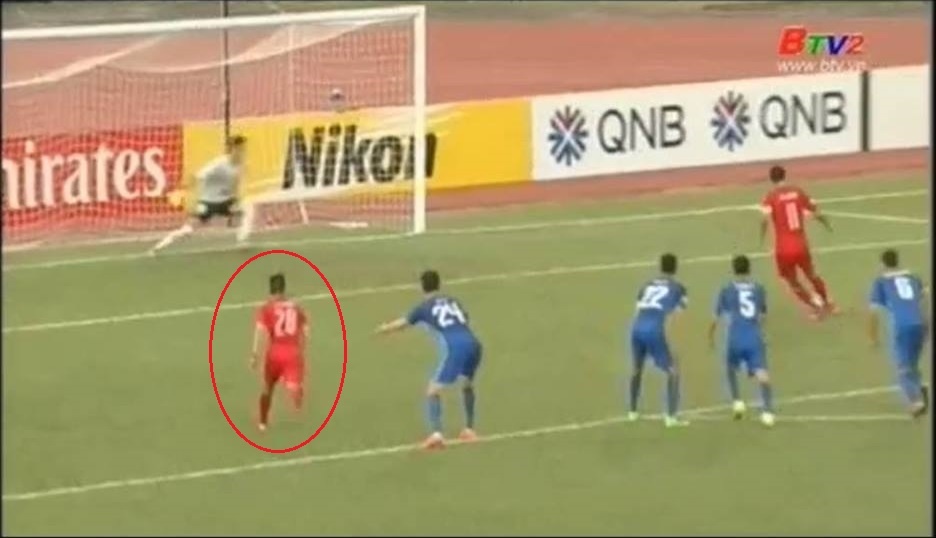 Trên chấm phạt đền, tiền đạo Anh Đức lạnh lùng thực hiện cú đá penalty theo kiểu panelka điệu nghệ để cân bằng tỷ số. Tuy nhiên xem lại pha quay chậm có thể thấy, khi Anh Đức tiếp xúc với trái bóng, đồng đội của anh là tiền đạo Công Vinh đã ở trong vòng cấm.