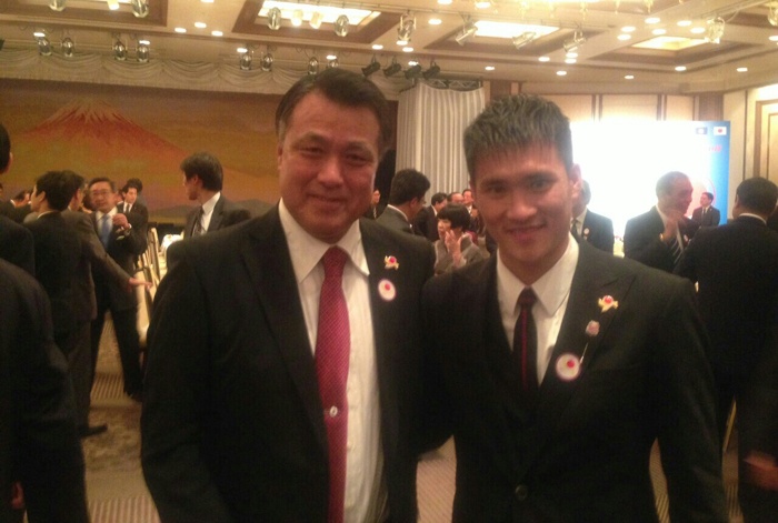 Chân sút người xứ Nghệ chụp ảnh cùng chủ tịch hiệp hội bóng đá Nhật Bản.