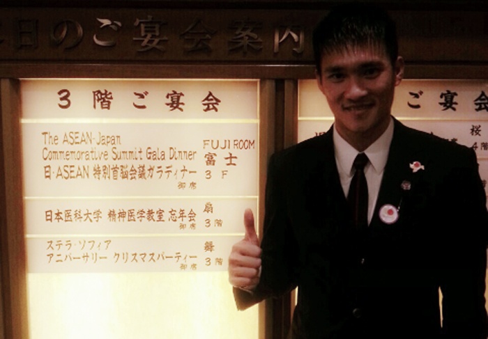 | Công Vinh chụp ảnh bên ngoài đại sảnh, nơi anh được mời tới dự tiệc cùng Thủ tướng Nhật Bản. |