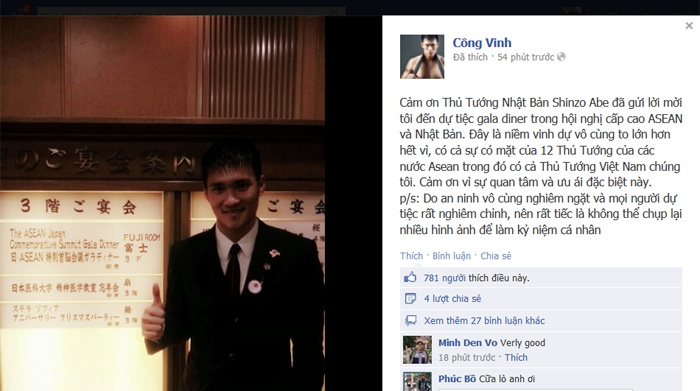| Công Vinh gửi lời cảm ơn Thủ tướng Nhật Bản. |