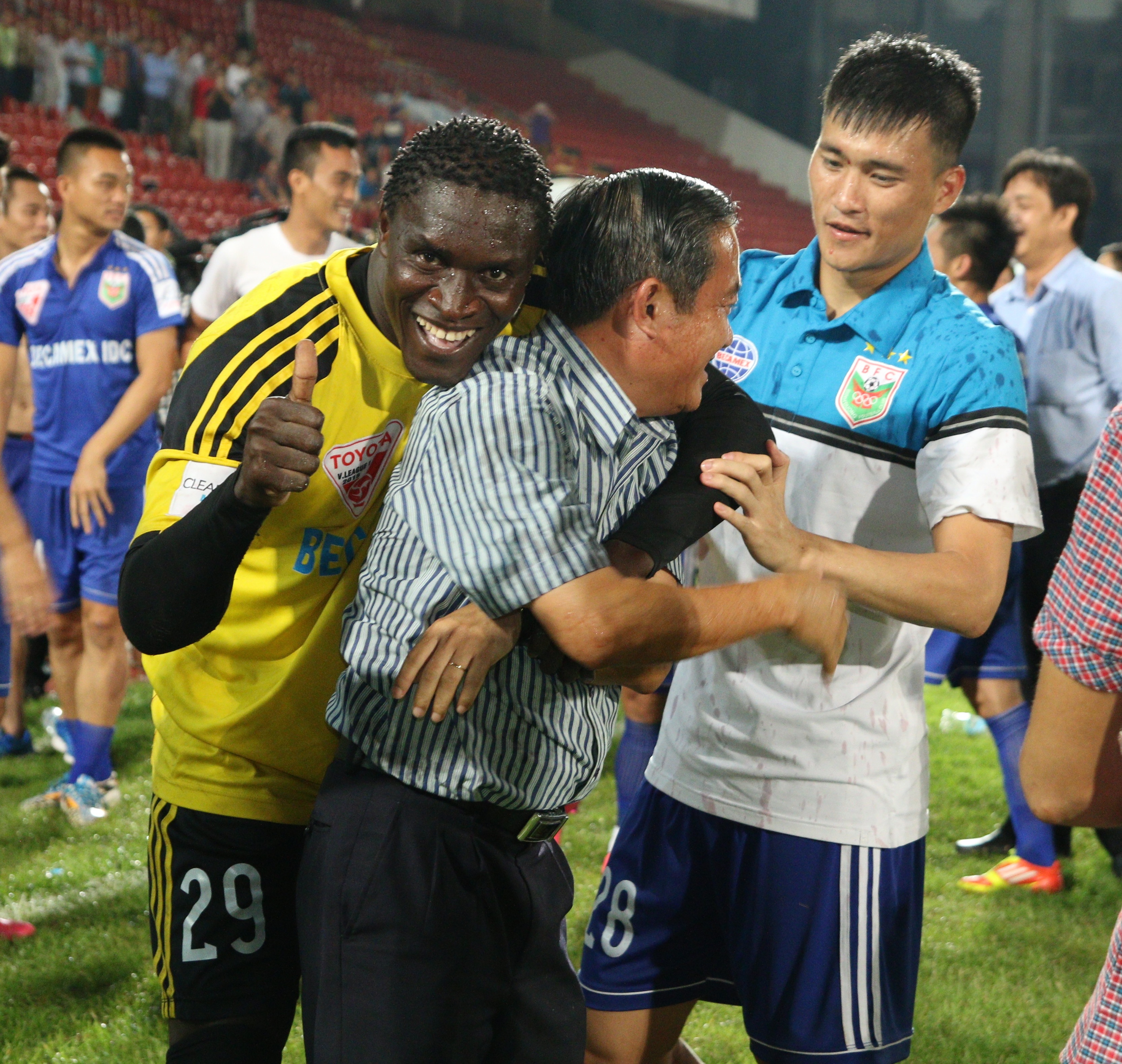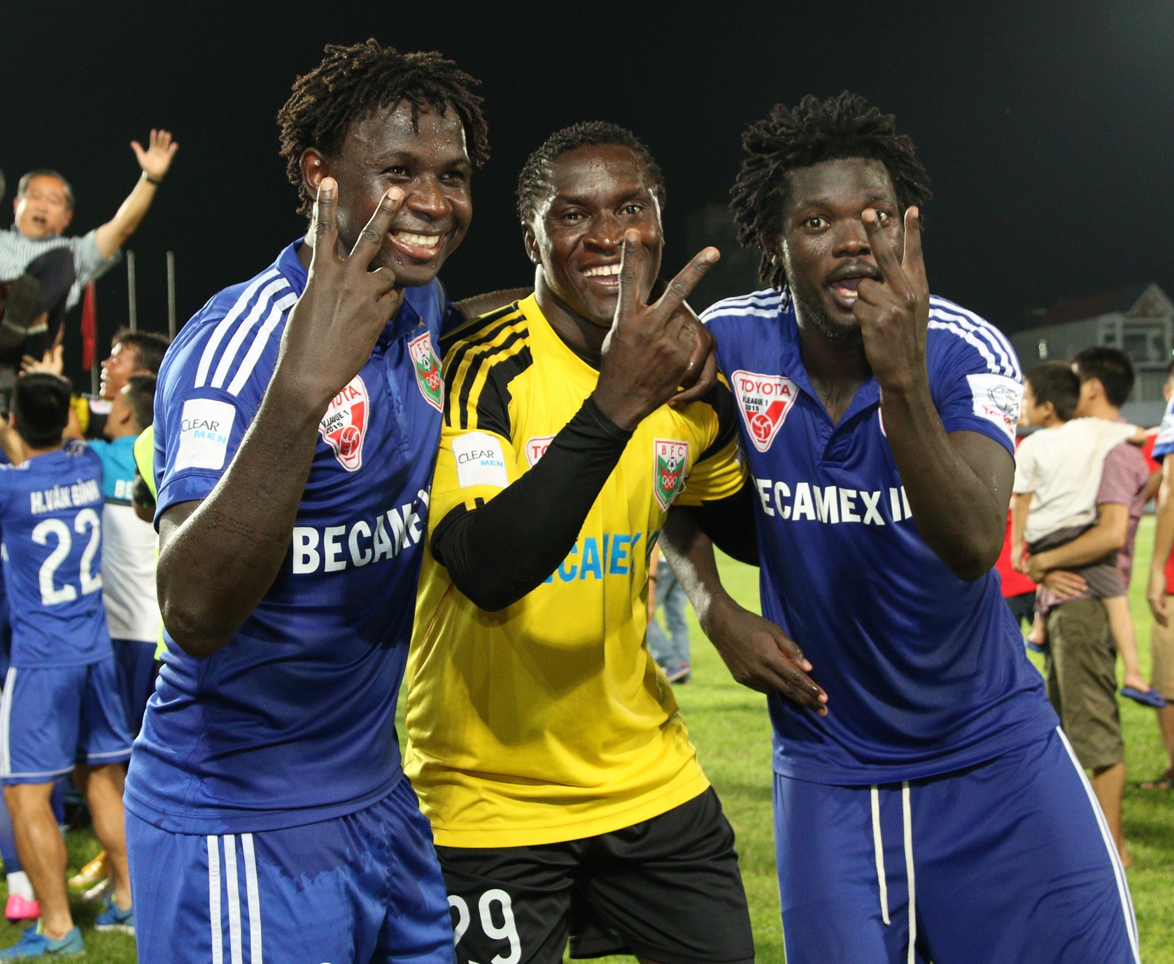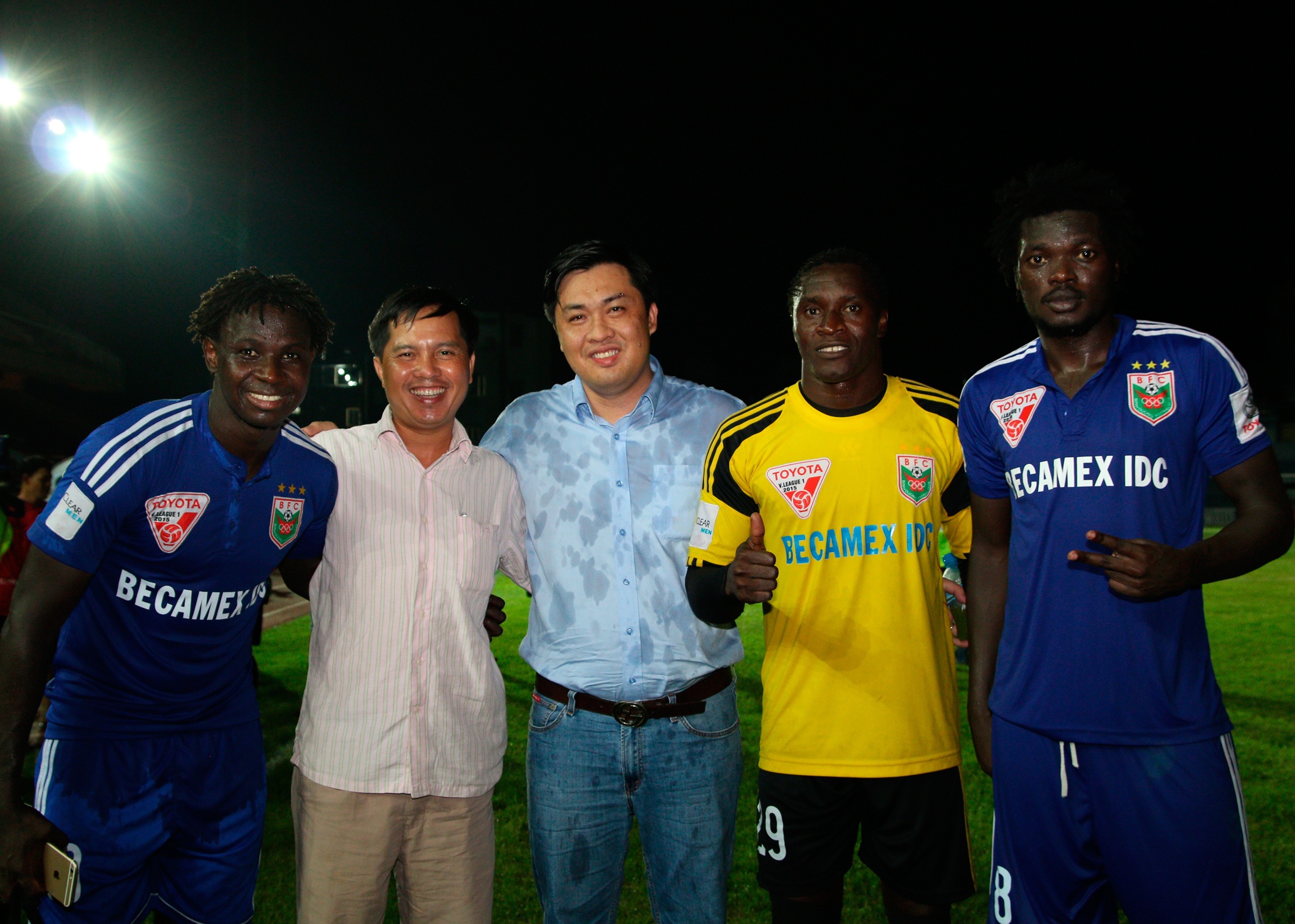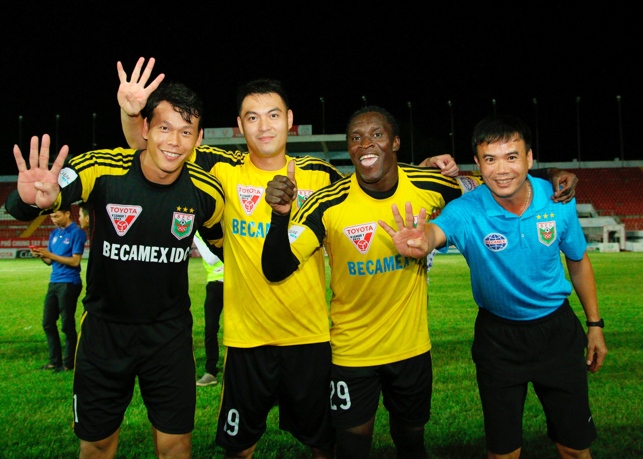 | Giám đốc điều hành Cao Văn Chóng chia vui cùng các ngoại binh Abass, Moses và thủ môn nhập tịch Nguyễn Quốc Thiện Esele. Ở hai vòng đấu còn lại, B.Bình Dương sẽ gặp QNK Quảng Nam (sân nhà) và Đồng Tháp (sân khách). |