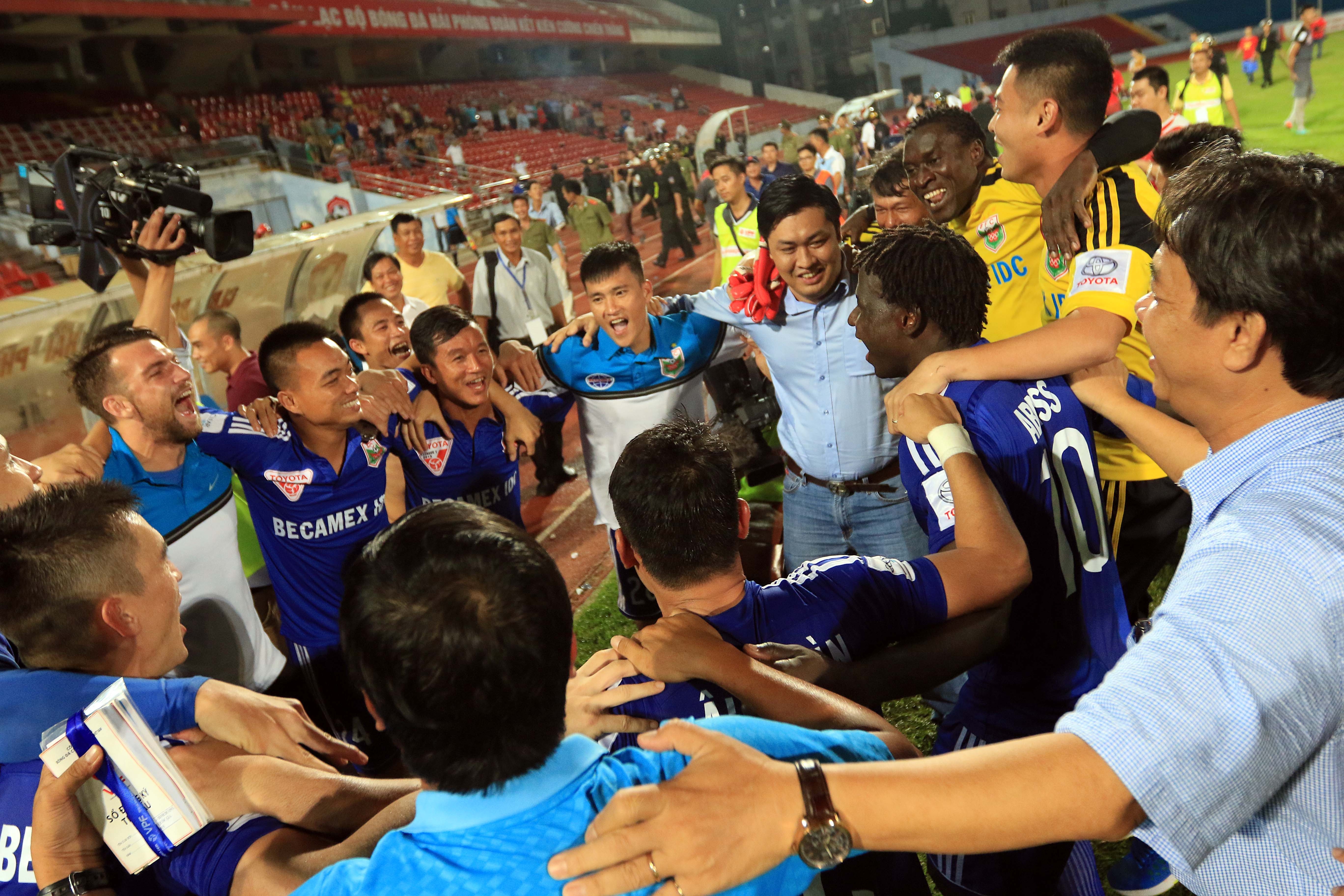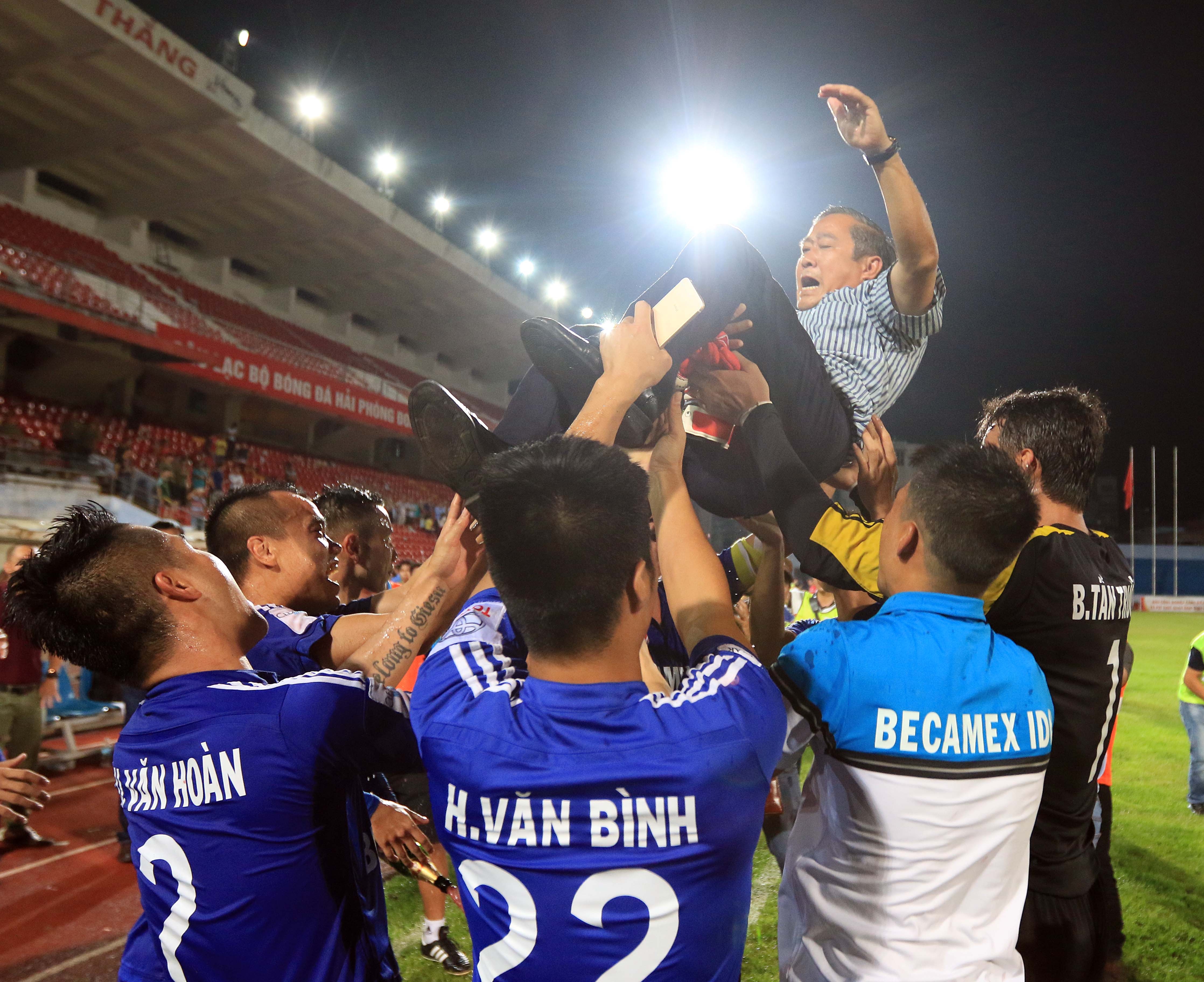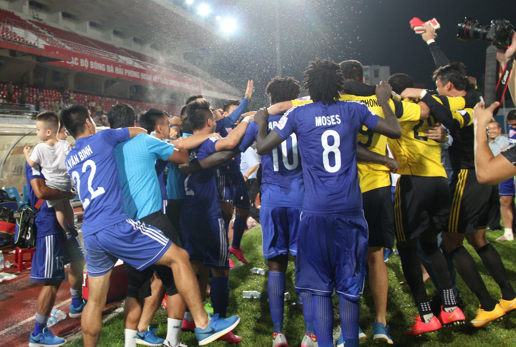 | Các cầu thủ nhảy múa ăn mừng chức vô địch ngay trên sân Lạch Tray. Dự kiến, toàn đội sẽ nhận hơn 10 tỷ tiền thưởng cho chiến công này, bao gồm 5 tỷ từ BLĐ đội bóng, 3 tỷ từ ban tổ chức, chưa kể tiền thưởng từ UBND tỉnh Bình Dương cũng như các nhà tài trợ. |
