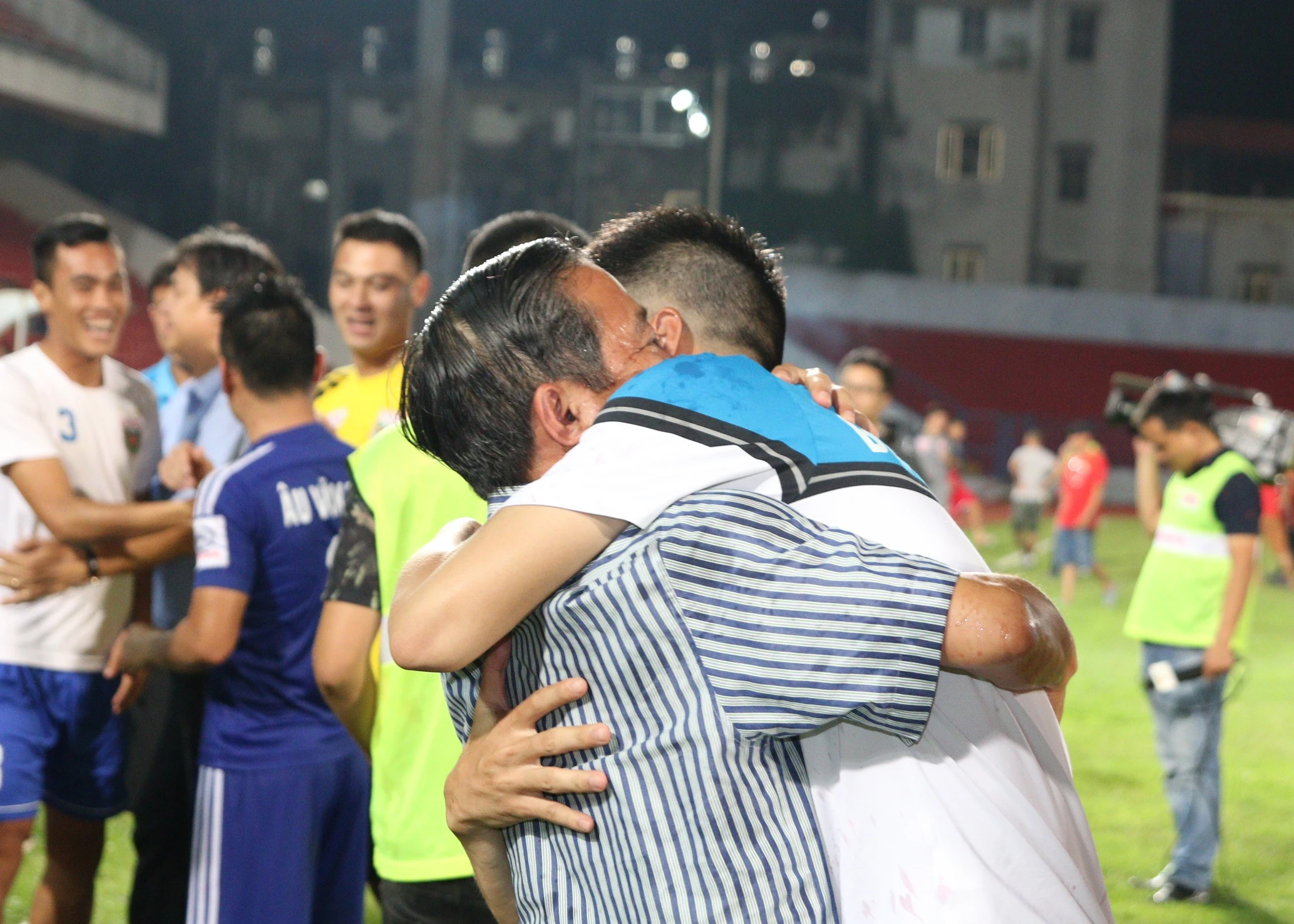 | Lê Công Vinh đến chia vui cùng chủ tịch đội bóng - ông Nguyễn Minh Sơn. Đây là lần đầu tiên, Công Vinh vô địch V.League dù anh là chân sút ghi bàn nhiều nhất trong lịch sử giải đấu. |