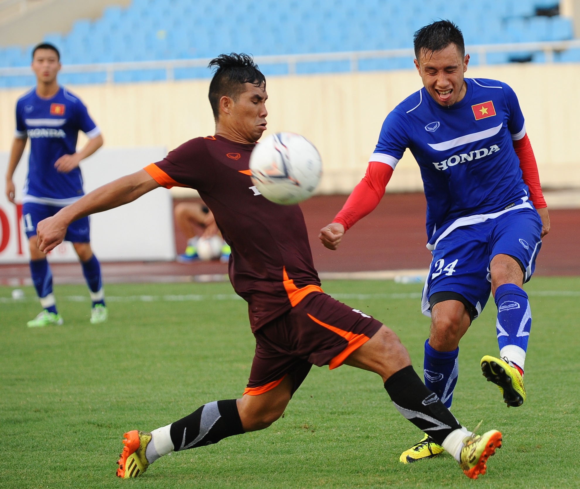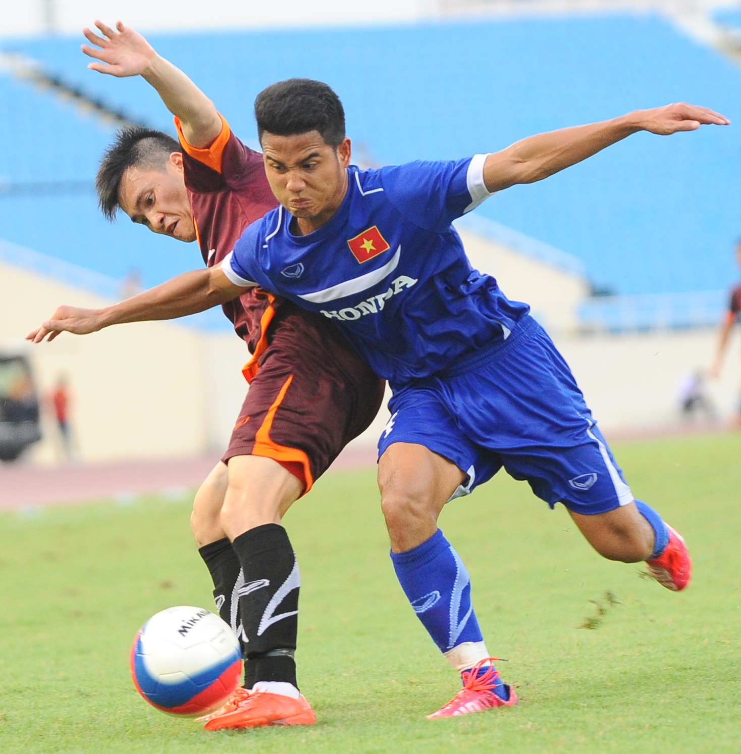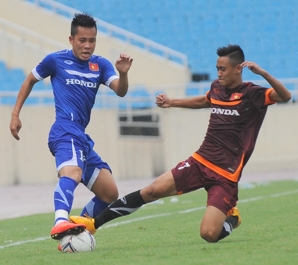 | Trận đấu tập giữa ĐT Việt Nam (áo nâu) - U23 Việt Nam (áo xanh) diễn ra lúc 17h ngày 10/5 trên SVĐ Mỹ Đình. Nhà cầm quân người Nhật Bản xếp các cầu thủ U23 ngồi dự bị trong trận hòa U23 Hàn Quốc so tài với đội hình mạnh nhất của tuyển Việt Nam. |