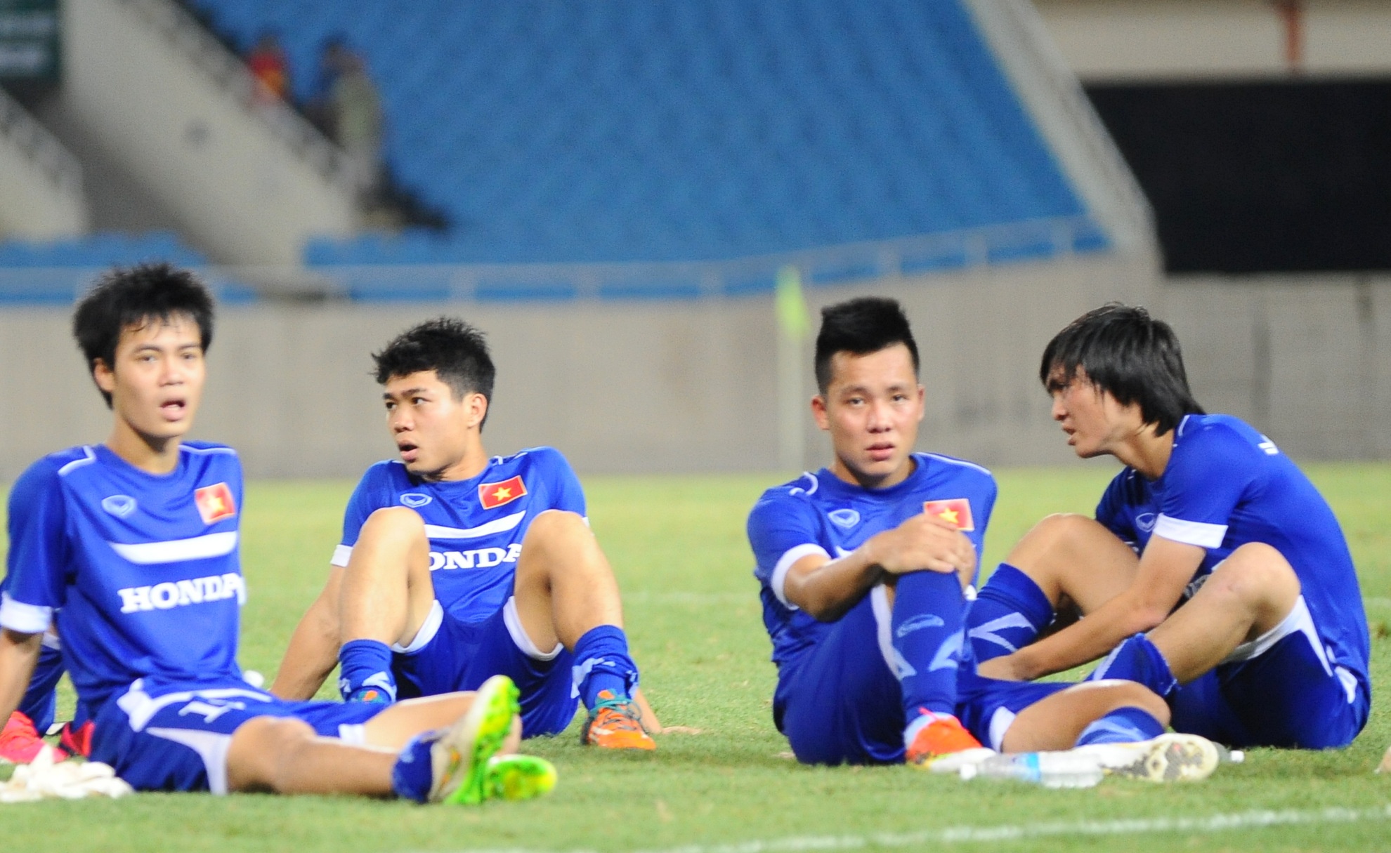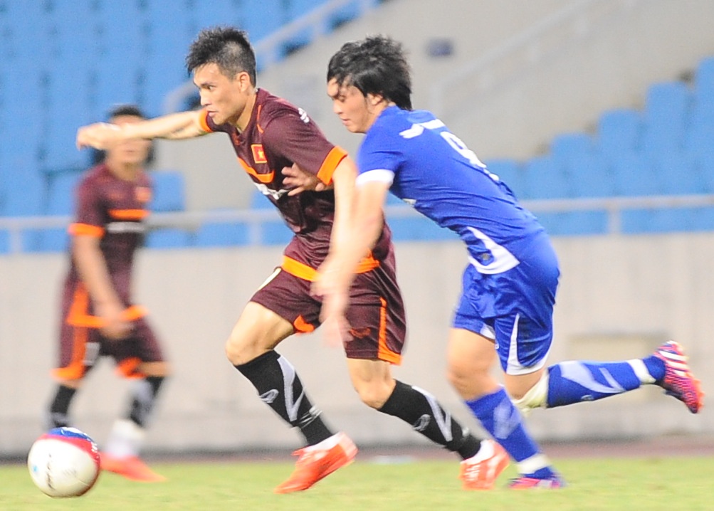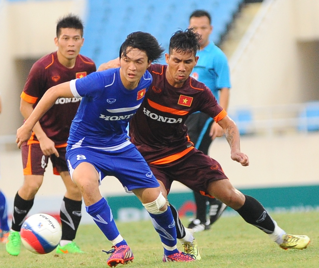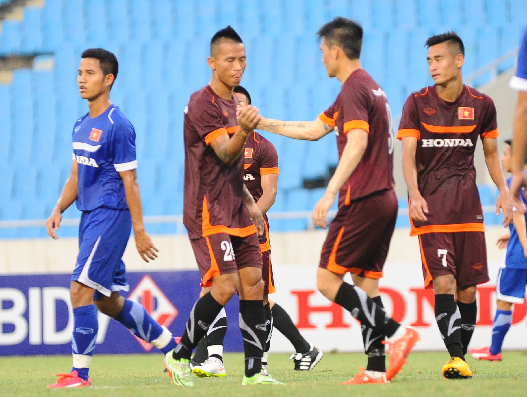 | Trận đấu tập giữa ĐT Việt Nam (áo nâu) - U23 Việt Nam (áo xanh) diễn ra lúc 17h ngày 10/5 trên SVĐ Mỹ Đình. Nhà cầm quân người Nhật Bản xếp các cầu thủ U23 ngồi dự bị trong trận hòa U23 Hàn Quốc so tài với đội hình mạnh nhất của tuyển Việt Nam. |