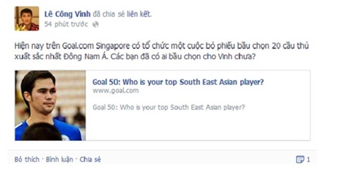 Trang Goal Singapore đã tiến hành cuộc bình chọn Cầu thủ xuất sắc nhất Đông Nam Á, trong đó Công Vinh là ứng viên duy nhất đến từ Việt Nam. Ban đầu, lượng bình chọn của tiền đạo người xứ Nghệ rất ít, chỉ chưa tới 2%. Tuy nhiên, tất cả đã thay đổi sau khi có một trang facebook với tên Lê Công Vinh đứng ra kêu gọi bình chọn. Lượng phiếu bầu cho chân sút mới đầu quân cho CLB Sapporo của Nhật tăng chóng mặt và tới khi khép lại vào lúc 0h00 ngày 5/8 anh đứng đầu danh sách 20 cầu thủ xuất sắc nhất với 63,8% phiếu bầu.