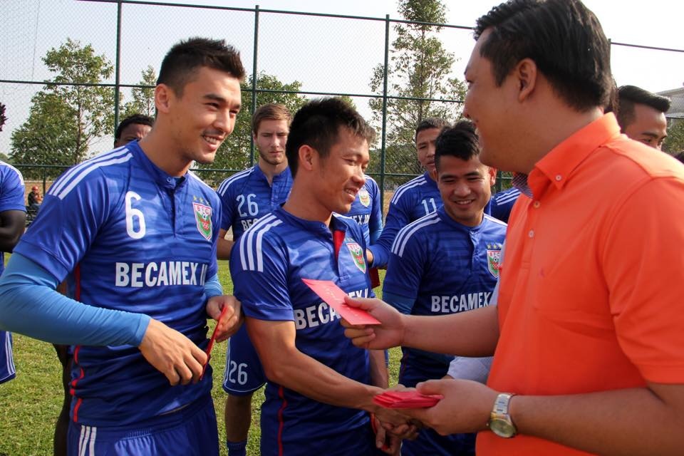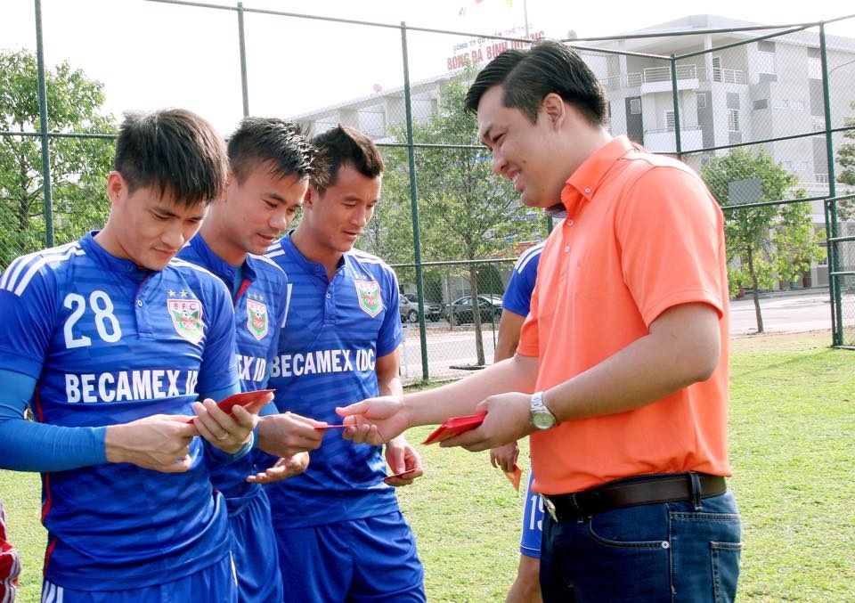 | Các cầu thủ của CLB Bình Dương phấn khởi khi nhận được phong bao lì xì và những lời chúc may mắn của lãnh đạo CLB. |
