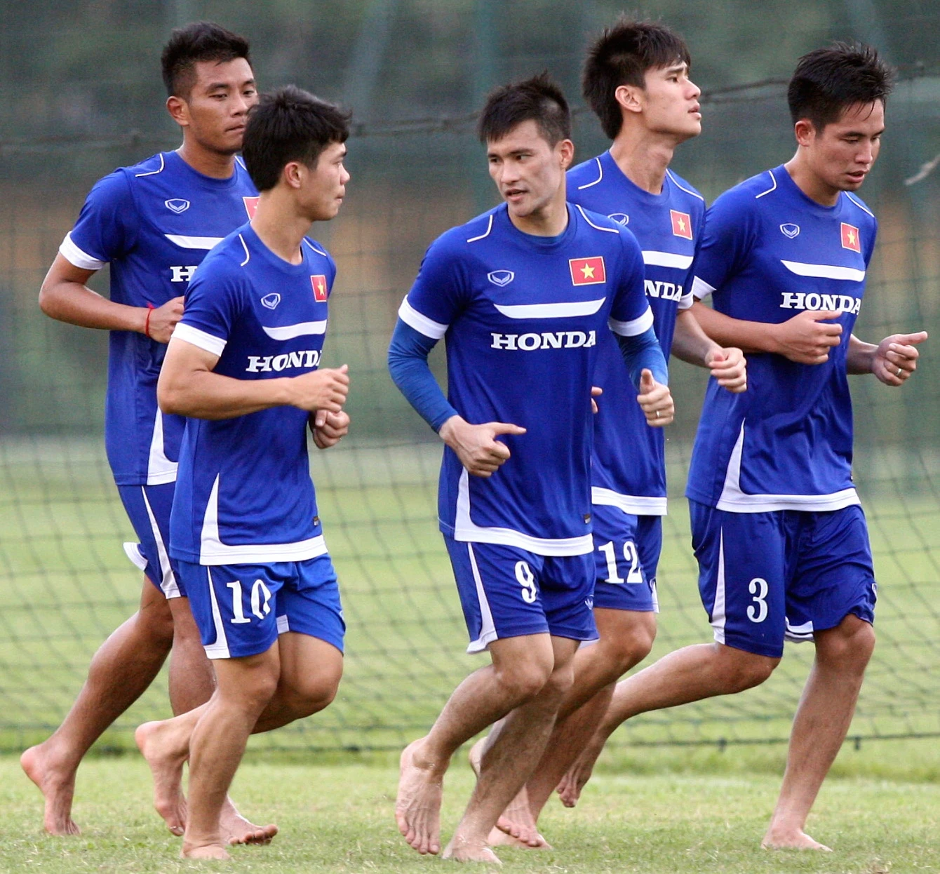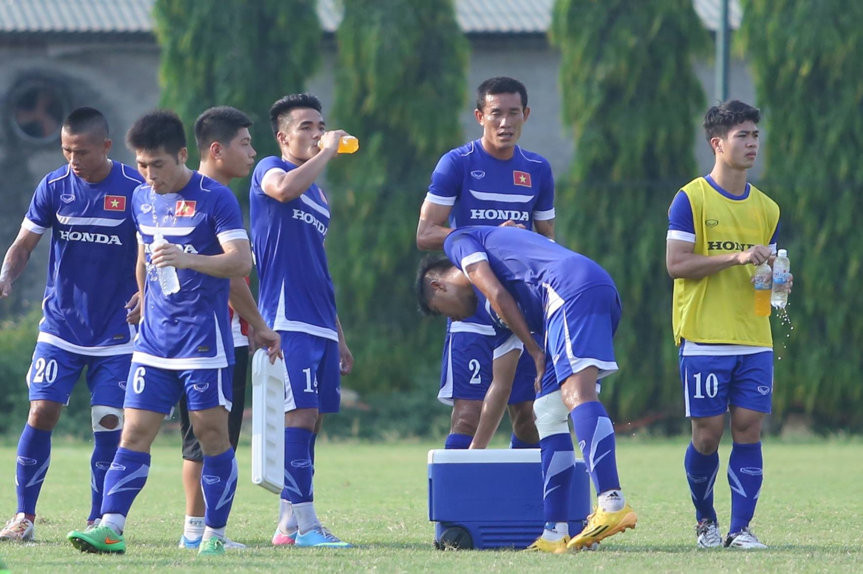 | Thời tiết Hà Nội khá oi nóng ảnh hưởng đến thể lực của các tuyển thủ. Học trò của HLV Miura liên tục phải uống nước trong buổi tập kéo dài 2 tiếng. Hôm nay (15/5), ĐT Việt Nam có buổi tập mở lúc 16h trên sân Trung tâm đào tạo trẻ của VFF. |