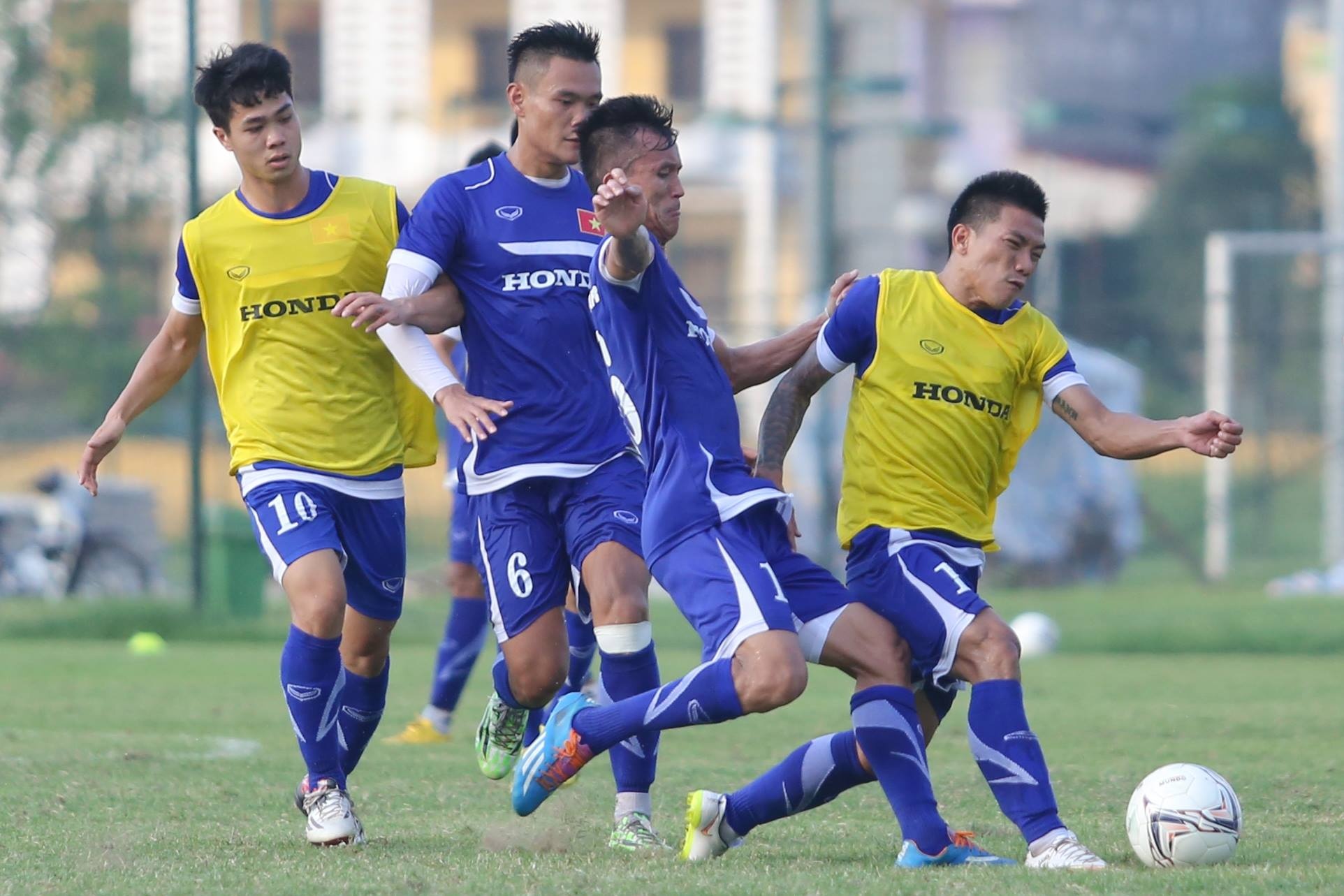 | Bộ đôi xứ Nghệ luôn chạy bám sát nhau trên sân tập của VFF, Công Phượng chú ý lắng nghe sự chỉ bảo từ đàn anh đồng hương. Trong bài thi đấu đối kháng, HLV Miura thường bố trí cầu thủ đang khoác áo CLB HAGL đá tiền đạo lùi ngay phía sau vị trí cao nhất trên hàng công của Công Vinh. |