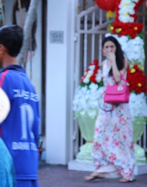 | Trong khi đó Thủy Tiên diện váy hoa dài nữ tính. Cô liên tục che mặt khi bước ra khỏi nhà. Mặc dù cưới ở Kiên Giang nhưng rất nhiều phóng viên đã túc trực tại quê cô để tường thuật về đám cưới được mong đợi nhất năm 2014. |