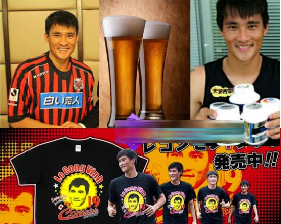 Công Vinh với mối nghi ngờ quảng cáo bia và loại thuốc thực phẩm chức năng khi sang Nhật. Riêng áo có hình ảnh anh đã có giá 19.950 yên (hơn 3,5 triệu đồng) và luôn cháy hàng.