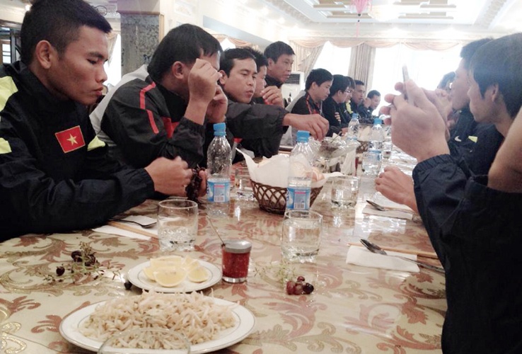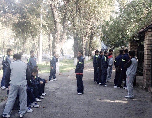 Trước đó, vào chiều 13/10 thầy trò HLV Văn Sỹ có buổi tập đầu tiên trên đất khách nhưng ở sân phụ. Trong buổi tập này thuyền trưởng người Nam Định cho các học trò chủ yếu thả lỏng để hồi phục sức khỏe sau hành trình di chuyển "hành xác". ĐT Việt Nam mất gần cả ngày di chuyển, từ Doha (Qatar) sang UAE, quá cảnh ở đây 10 tiếng, rồi tiếp tục bay sang Kazakhstan và chặng cuối cùng mới bay đến Tashkent (Uzbekistan). Trên trang cá nhân, tiền vệ Mai Tiến Thành chia sẻ: "Mệt mỏi vì di chuyển nhưng toàn đội vẫn vui nhờ chiến thắng".