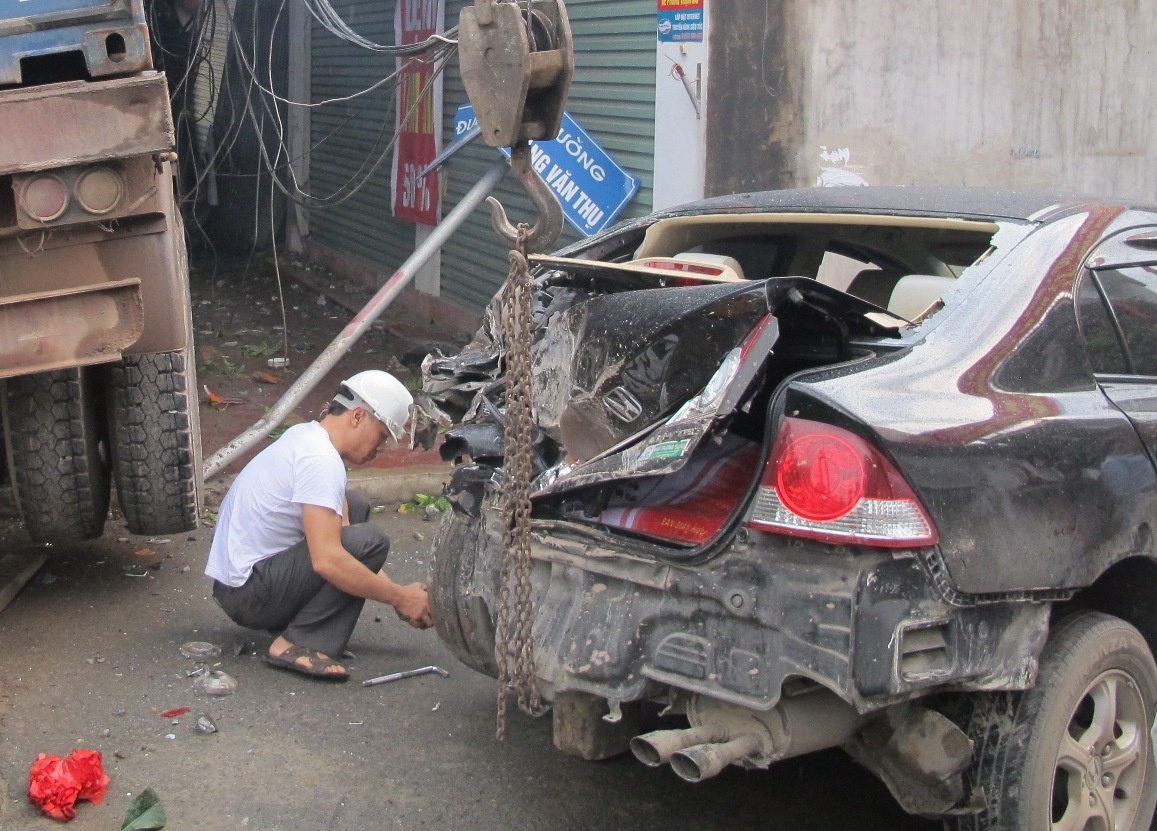 Tại hiện trường, đầu và đuôi ôtô 4 chỗ bị nát bét; container bị hư hỏng nặng, vỡ kính cabin. Tài xế ôtô bị thương nhẹ, tinh thần hoảng loạn.