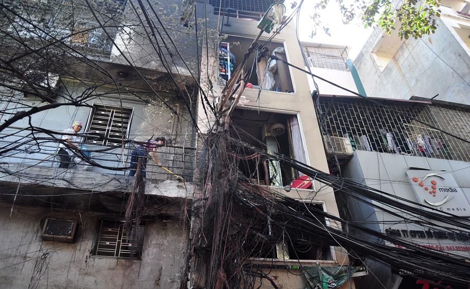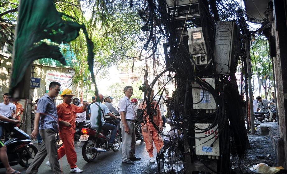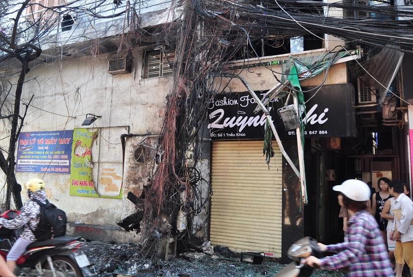 | Ngọn lửa tiếp tục lan vào hai hộ số 1 Triều Khúc và cửa hàng cà phê số 517 Nguyễn Trãi (Thanh Xuân) khiến cửa hàng quần áo của anh Lưu Cảnh Tuân (38 tuổi) bị thiêu rụi. Rất may, khi đó cửa hàng anh Tuân chưa mở cửa, không có ai bên trong. Cột điện nơi xảy ra vụ việc là điểm tập kết dây diện của cả khu phố. |